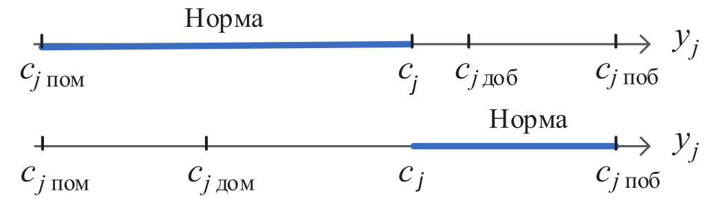 Принятому за норму отрезку шкалы [yjmin, cjн] соответствует полуинтервальное ограничение сверху: yj ≤ cjн (не более нижней границы), а отрезку шкалы [cjв, yjmax] – ограничение снизу: yj ≥ cjв (не менее верхней границы). Эти ограничения могут рассматриваться как частные случаи совпадения одной из границ интервальной нормы с границей шкалы – предельным отклонением от нормы. Ограничение «не более» cj показано в верхней части рисунка 2, а ограничение «не менее» cj – в его нижней части.