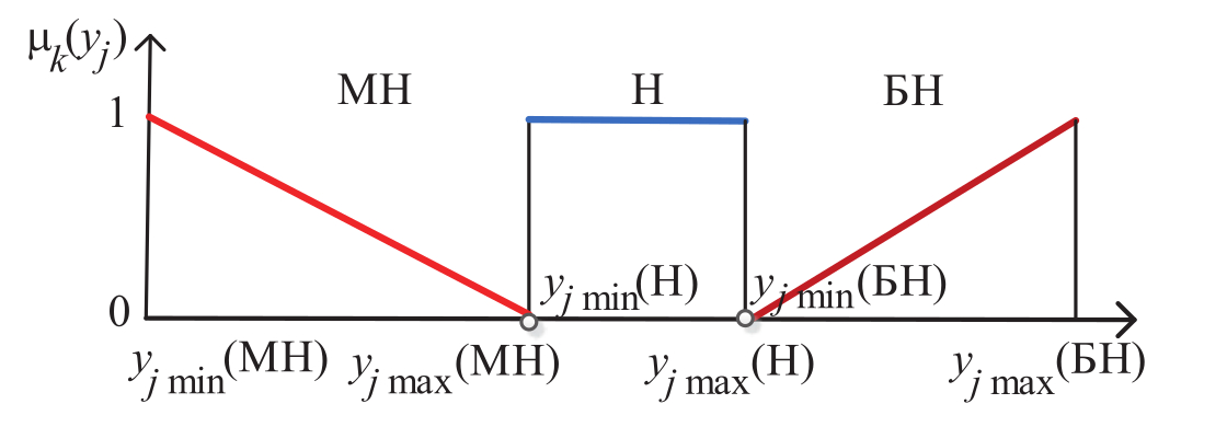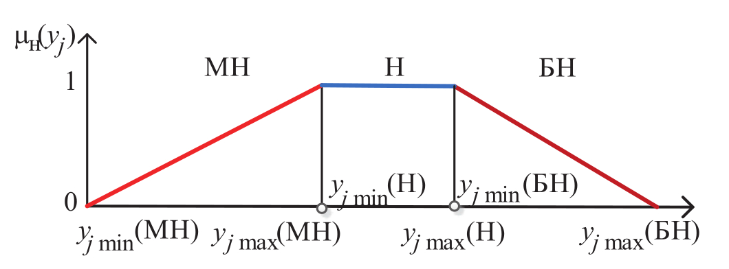 Моделирование принадлежности норме предполагает построение соответствующей функции принадлежности (ФПр) на шкале каждого оцениваемого показателя [13]. В отсутствие уточняющей информации эта функция является кусочно-линейной – для интервальной нормы эта функция трапецеидальная, а для точечной нормы треугольная. У трапецеидальной функции на отрезке шкалы [cjн, cjв] принадлежность норме одинакова, а при отклонении от границ cjн и cjв в обе стороны принадлежность норме равномерно убывает (рисунок 4). Шкала значений показателя на рисунке 4 делится на три отрезка: [yjmin(МН), yjmax(МН)], [yjmin(Н), yjmax(Н)], [yjmin(БН), yjmax(БН)]. Эти отрезки шкалы значений показателя трактуются как «меньше нормы» (МН), «норма» (Н) и «больше нормы» (БН).