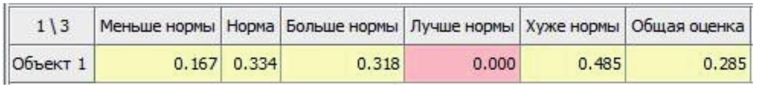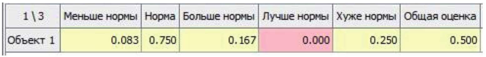 Принадлежности объекта 1 по нейтральным показателям классам совпали с расчётными величинами, приведёнными в левой части таблицы 1. Принадлежность объекта 1 классу ЛН равна нулю. Индикатор состояния объекта 1 относительно вектора важности (0,5; 0,5; 0) классов ХН и Н равен 0,5.
