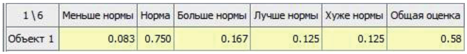 Принадлежности объекта 1 классам совпали с расчётными величинами, приведёнными в правой части таблицы 1. Принадлежность объекта 1 с оптимизируемыми показателями классу ЛН 0,125 > 0 отражает меру его развития. Индикатор состояния объекта 1 относительно вектора важности (0,33; 0,33; 0,33) классов ХН, Н, ЛН равен 0,58. Среднеарифметическая оценка ИС объекта 1 по всем показателям вычисляется как (0,50 + 0,58)/2 = 0, 54. Эта величина, далёкая от единицы, отражает значительные отклонения объекта 1 от нормы и от оптимальных значений показателей.
