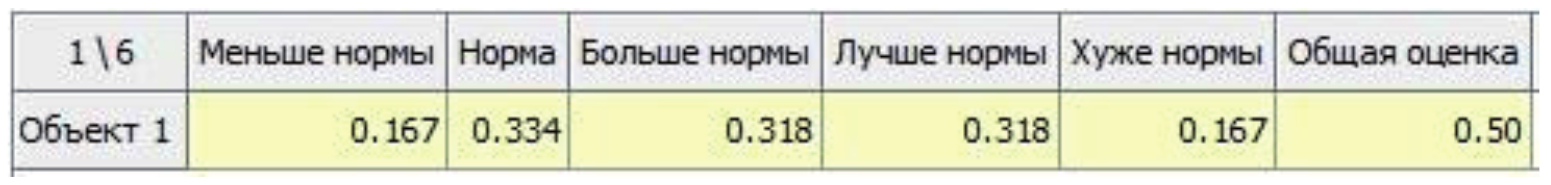 Соотношение между составляющими целостной оценки задаётся вектором весов: w = (w(µМН(x)); w(µН(x)); w(µБН(x))). Значения весов задаются в зависимости от интереса ЛПР к этим составляющим. В том случае, когда отклонения в разные стороны от границ нормы неравноценны, классы МН и БН имеют разную важность. Бо̀льшая важность одного из двух отклонений значения показателя качества от границы нормы будет указывать на бо̀льшую опасность ухудшения свойств Об. Учёт важности отклонений от нормы позволяет оценить тенденцию более опасного ухудшения свойств Об.