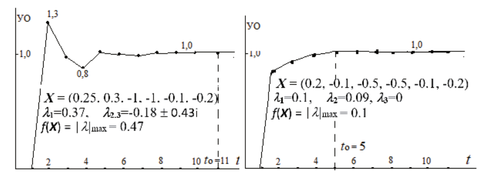Рисунок 6 – Влияние величин собственных значений на кривые развития импульсного процесса и скорость сходимости в орграфе для V(исх.) = (0, 0, 1) и Р(0) = (5, 0, 0)