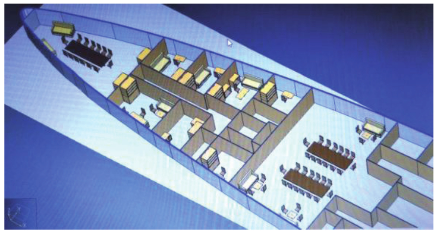 Принципиальным вопросом в проектирования судовой ПС является исследование помещений судна, учёт наличия вентиляции, размещения опасных предметов геометрии помещений. Результатом является подробная геометрическая 3D модель судна, включающая указания на физико-химические свойства материалов.