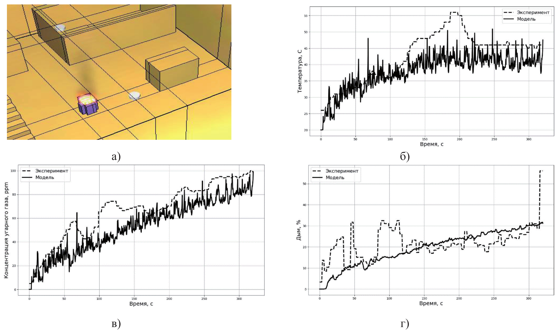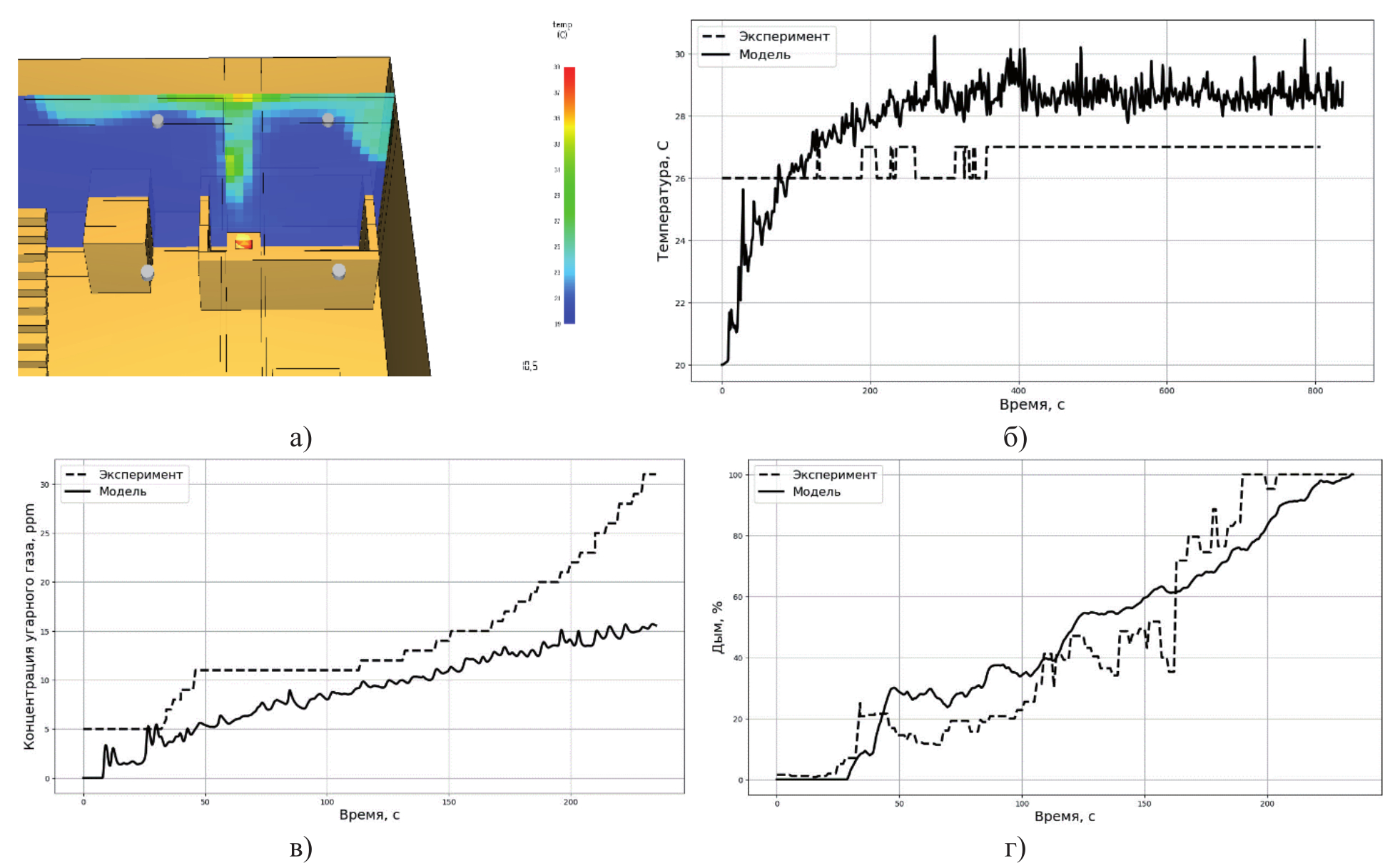 Сопоставление натурного и вычислительного экспериментов показало их близкие результаты. Вместе с тем выявлены различия, обусловленные неточностью задания характеристик материалов горения, неточностью определения начала горения, случайными движениями воздушных потоков, влияющими на процесс горения в натурном эксперименте. Например, изменение концентрации дыма (рисунок 5г) в натурном эксперименте показало наличие выбросов в начале горения, вызванное случайными потоками воздуха, которое может приводить к ложным срабатываниям.