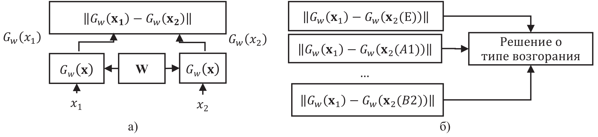 На вход каждой сети поступают векторы x1 и x2 которые содержат показания датчиков при отсутствии возгорания и показания датчиков при наличии возгорания данного класса. ИНС основана на оценке расстояния, которое можно рассматривать как меру похожести между измеренными значениями факторов пожара определённого типа. Для вычисления похожести используют две нейронные сети с одинаковыми весами W для двух входных векторов Gw(x1) и Gw(x2).