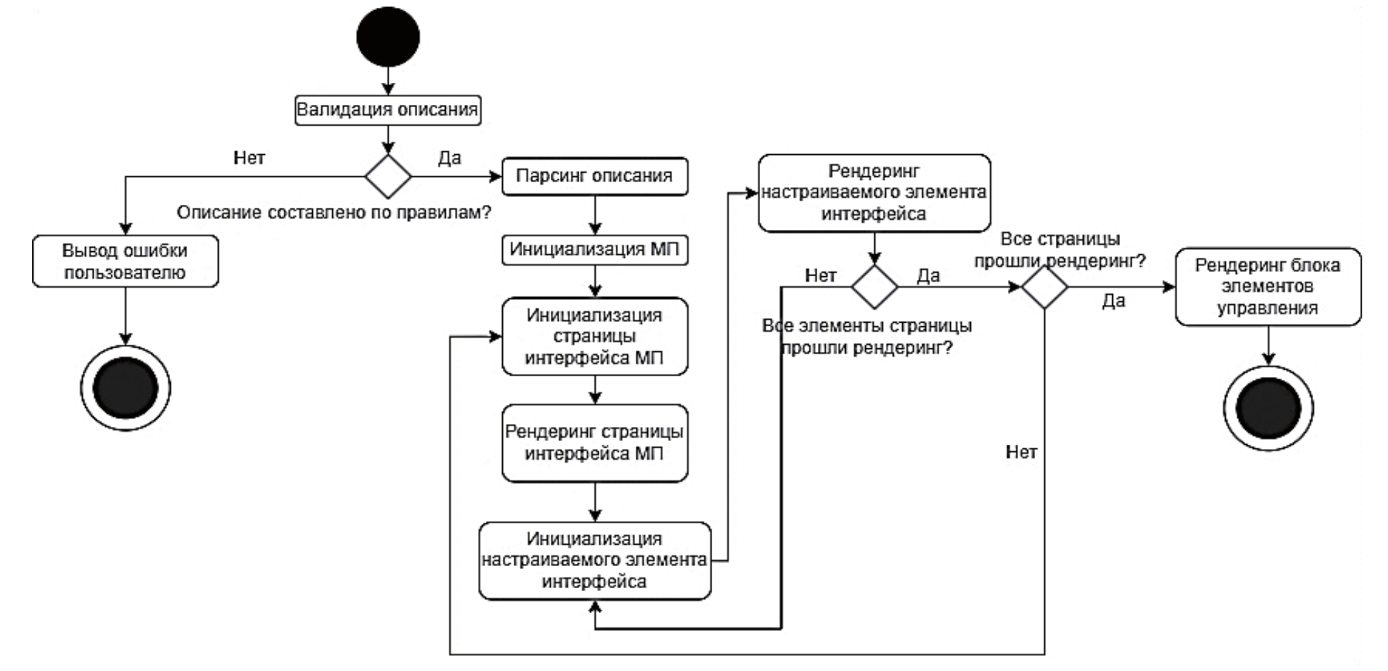 Разработка адаптируемого интерфейса включает: обработку файла описания интерфейса МП; рендеринг (визуализацию) блока представления интерфейса МП.