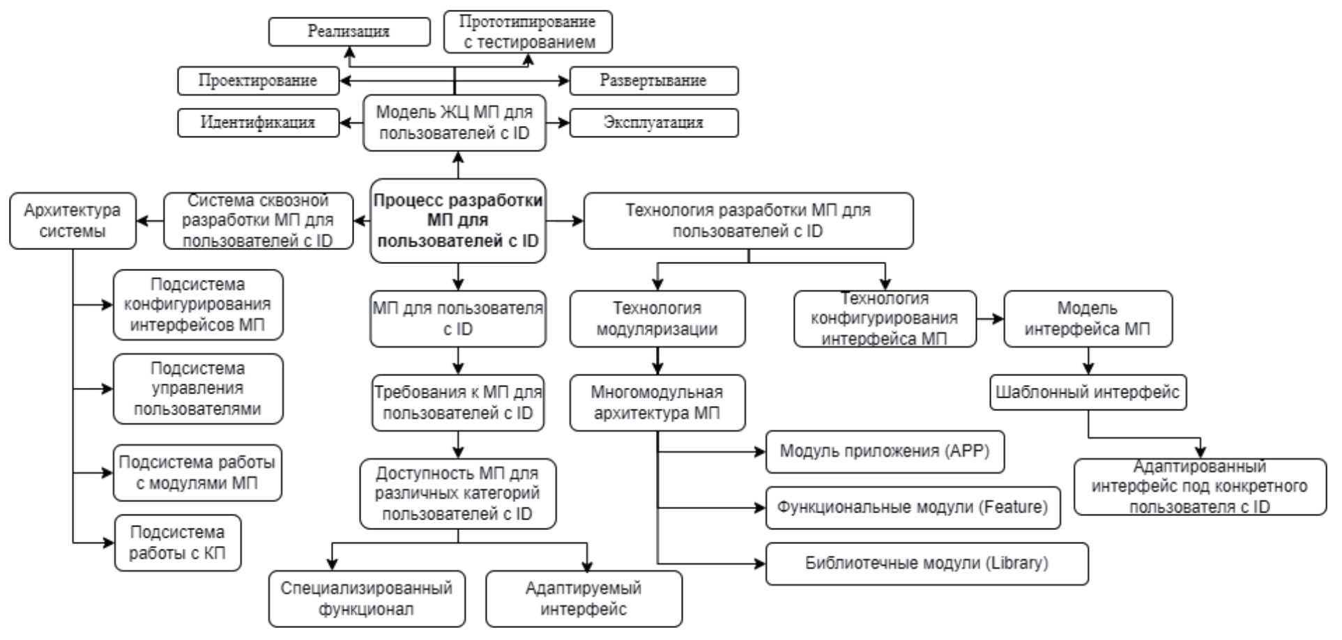 Категоризация МП для пользователей с ОИВ позволяет объединить знания о таких МП, как об объектах разработки, и описать их как самостоятельную область знаний. В качестве формальной модели представления знаний выбрана онтологическая модель. Использование этой модели позволяет извлекать знания о различных аспектах процесса разработки МП для пользователей с ОИВ, технологиях и средствах разработки и применять их для создания МП, доступных людям с различными интеллектуальными возможностями и ограничениями. Онтология процесса разработки МП для пользователей с ОИВ представлена на рисунке 4.