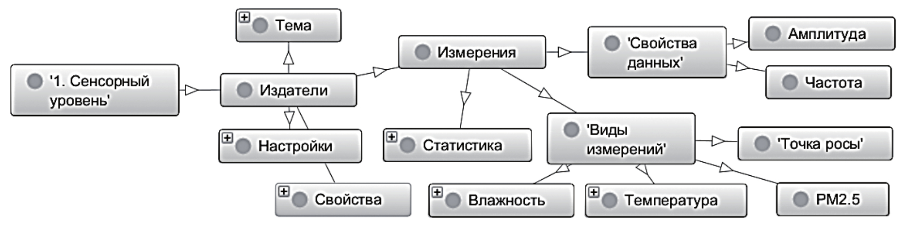 На рисунке 2 показаны значимые характеристики издателей, расположенных на сенсорном уровне: измерения (их виды, статистика и свойства данных), свойства устройств, настройки и публикуемые темы.