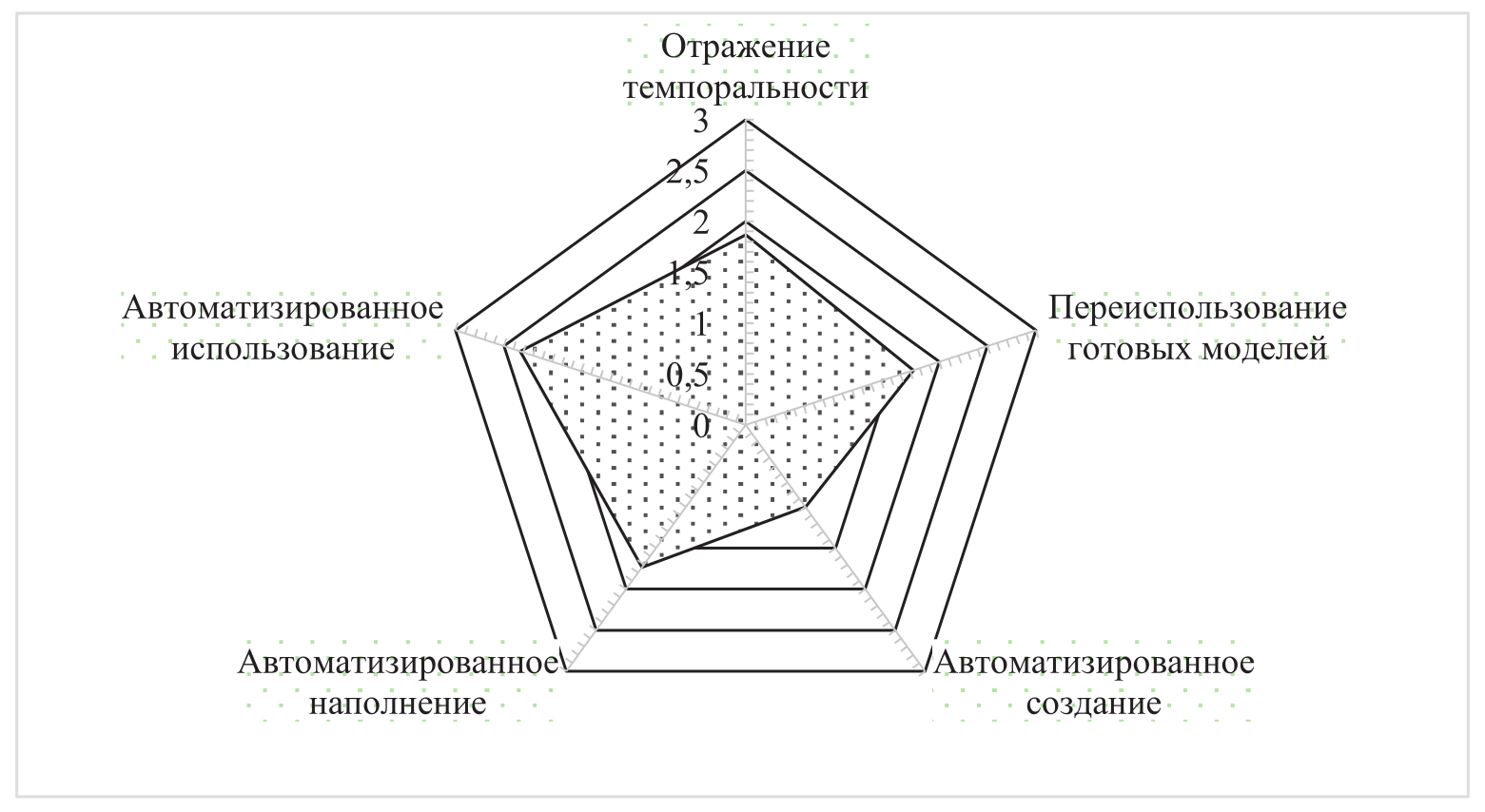 Рисунок 3 – Усреднённая оценка степени автоматизации систем информационного обеспечения на основе онтологических моделей (расшифровка числовых значений дана в таблице 2)