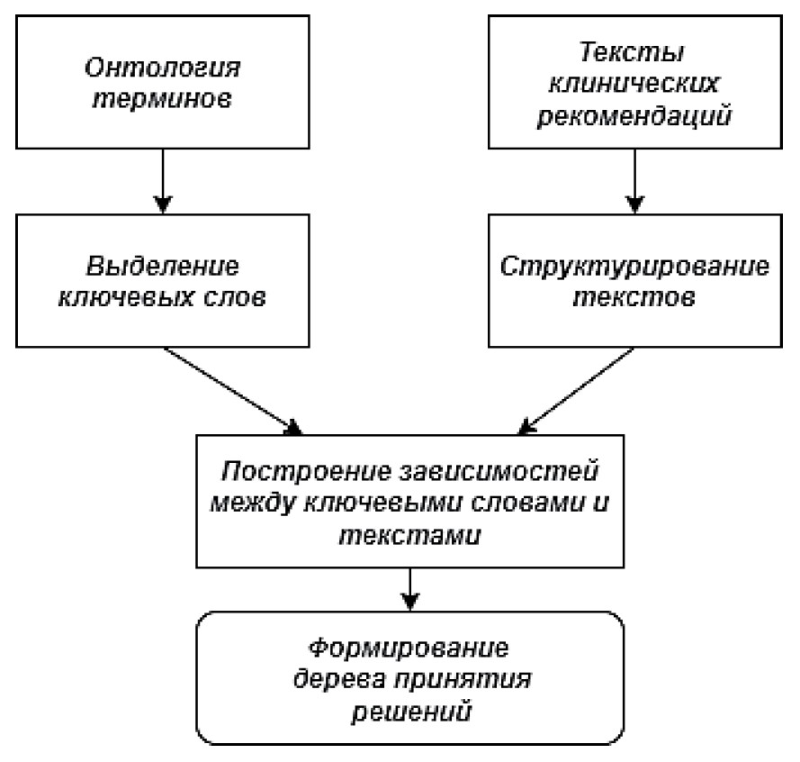 Указанные данные применяются для создания медицинских информационных, экспертных или рекомендательных систем, в которых накопленную информацию объединяют в базы знаний (БЗ), формируя на их основе методы решения задач (диагностика пациента или назначение лечения). Эффективность использования сформированной БЗ зависит от типа хранимой информации, её структурированности и связей между элементами системы поддержки принятия решений (СППР). По данным исследования [1] лишь 10–20% информации, используемой в медицинских учреждениях, представлено в структурированной форме. Примером представления информации в неструктурированном виде являются тексты клинических рекомендаций. При формировании структуры БЗ необходим анализ таких текстов, который в медицинских учреждениях выполняют специалисты.