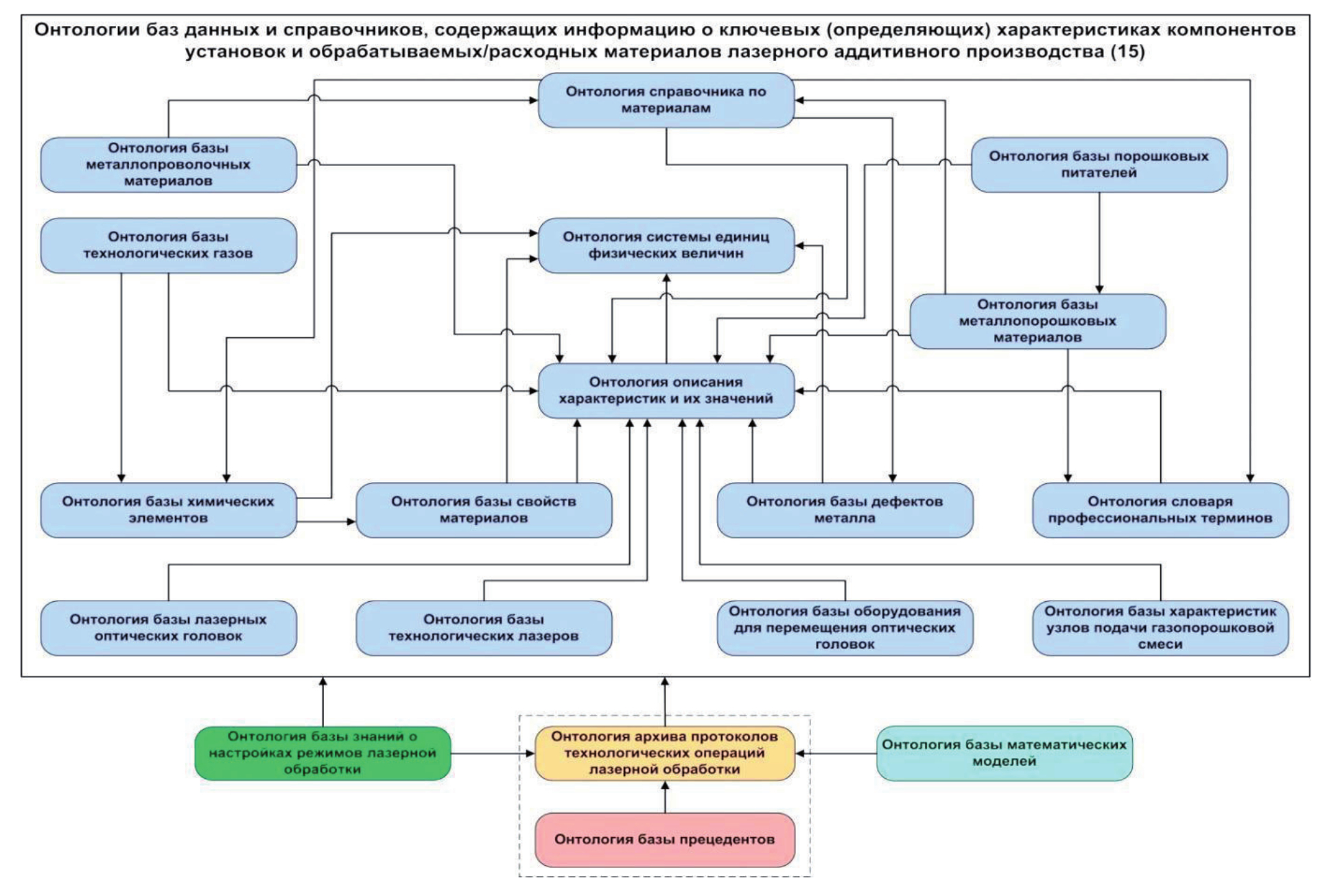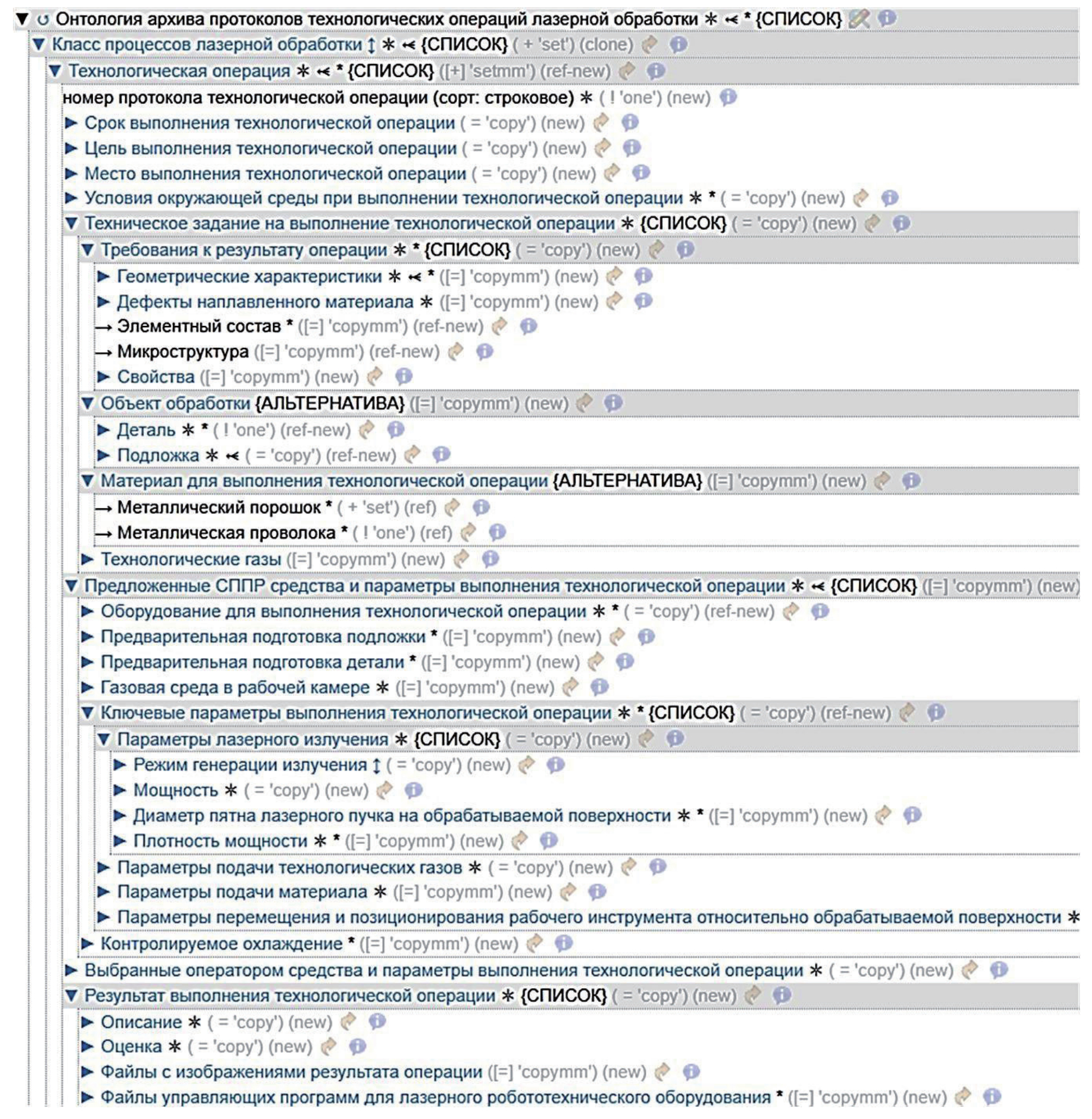 Состав ансамбля связанных ОМ определяется следующими факторами. Прежде всего, необходимо обеспечить возможность структуризации и формализации всей необходимой информации о проводимых технологических операциях (ТО) ЛАП, а также о характеристиках используемых материалов и оборудования. Должна быть обеспечена возможность формирования комплекса связанных БД и справочников, содержащих информацию о характеристиках обрабатываемых и расходных материалов АП, установок ЛАП и о протоколах проведённых ТО. В состав установок ЛАП входят: промышленные лазеры, укомплектованные лазерными оптическими головками; устройства, обеспечивающие перемещение головок относительно обрабатываемой поверхности и позиционирование деталей; порошковые питатели; узлы подачи материала в область сплавления/обработки и т.д. К обрабатываемым и расходным материалам относятся: металлические порошки и проволоки на основе различных сплавов; технологические газы, используемые в качестве транспортирующего, защитного и обжимающего средства. В состав ансамбля ОМ входят онтологии соответствующих баз и справочников, а также онтология архива протоколов ТО лазерной обработки.