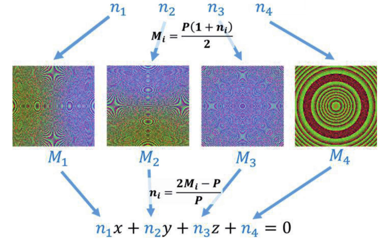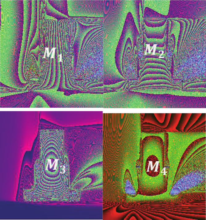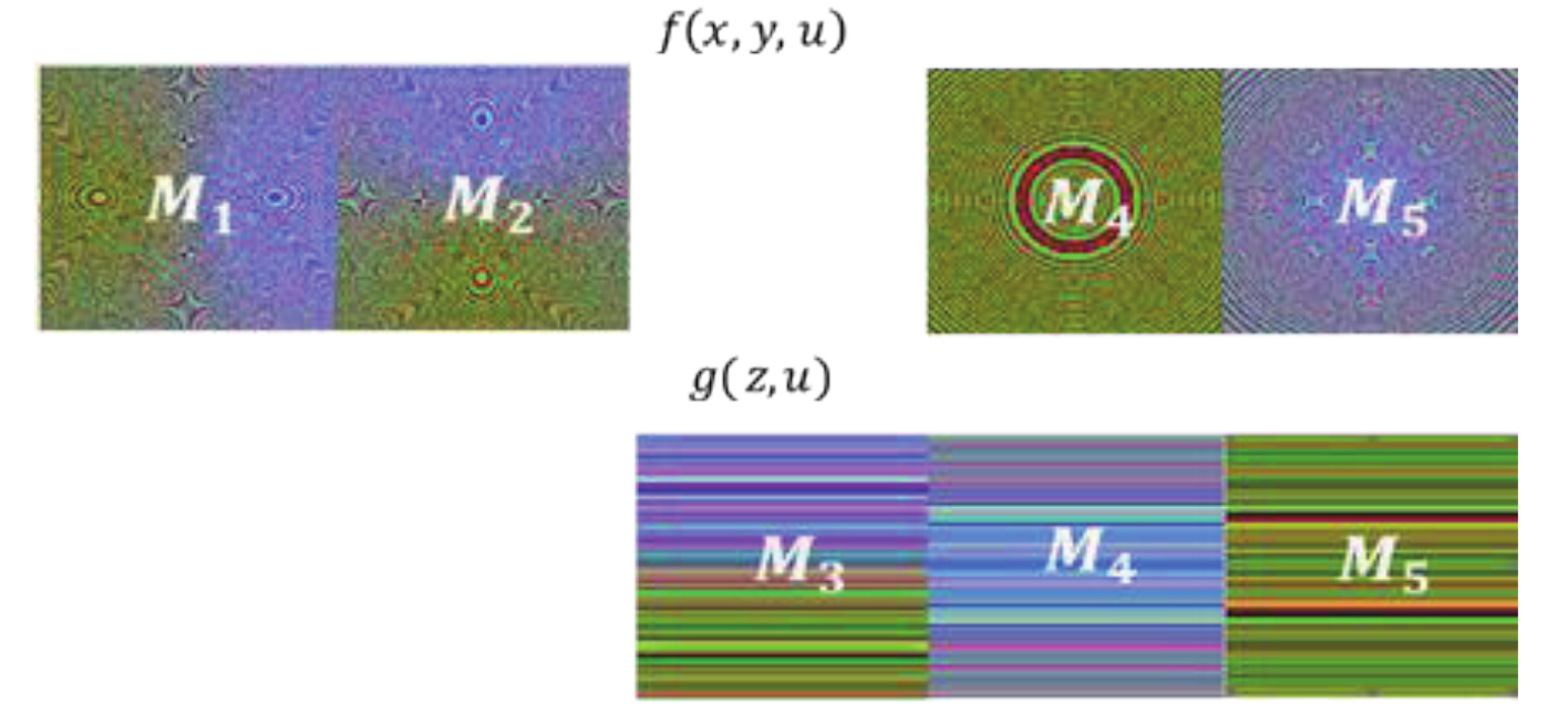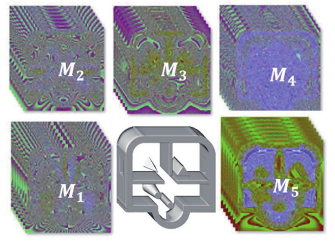 Предложенным способом можно кодировать информацию об аналитической функции любой размерности, описывая геометрические объекты любой сложности на заданной области аргументов. На рисунке 5 показано описание сложной геометрии, представленной тремя аргументами пространства (x, y, z) в виде пяти многослойных М-образов, где каждый слой образов Mi в заданной точке области характеризует значение ni. Кодировка цвета в точке каждого из М-образов представляется в RGB (Red, Green, Blue – цветовая модель) формате единым целочисленным значением, представляющим соответственно 167772161 возможных положительных целых чисел (), а значит точность представления значений компоненты ni доведена до пятого знака после запятой. Трёхмерный объект представлен пятью такими компонентами локальной функции (рисунок 5).