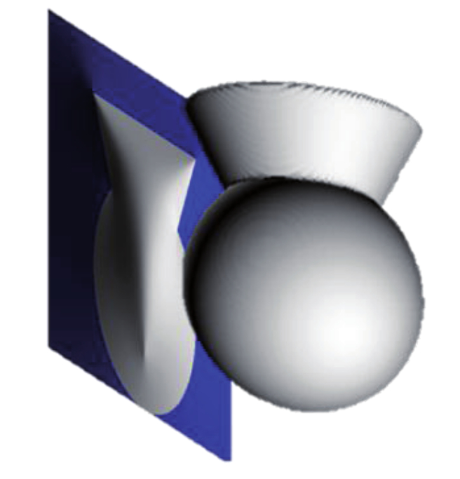 Аналитический подход к описанию геометрических моделей сопровождается сложными вычислениями и долгое время считался непригодным для автоматизации. Попытки применения RFM к построению поверхностных моделей [13] привели к значительной потере полезных данных, содержащихся на области описываемого функционала и, главное, к потере основного свойства увеличения размерности. В [14, 15] предложен метод функционально-воксельного моделирования (ФВ-моделирование), позволивший построить компьютерную модель таким образом, что она в целом сохраняет свойства аналитической модели на выбранной области в многомерном пространстве. Исследования показали, что такой подход к моделированию может позволить решать различные задачи геометрического моделирования на компьютере [16-19], а также вполне применим к задаче построения пространственного геометрического объекта по его аналитическим проекциям (чертежам). В предлагаемом материале ставится задача сформулировать аналитические принципы основных процедур получения описания 3D геометрического объекта по его плоским проекциям, описанным аналитическими функциями, представленными на компьютере в виде ФВ-моделей.