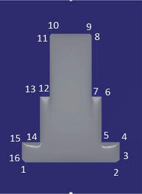 Из этого выражения видно, что контур содержит последовательно расположенные 16 узловых точек, как показано на рисунке 14, где синим цветом выделена область отрицательных значений z. На рисунке 15 представлены четыре М-образа, кодирующие значение локальных геометрических характеристик для получения локальной функции в выбранной точке: