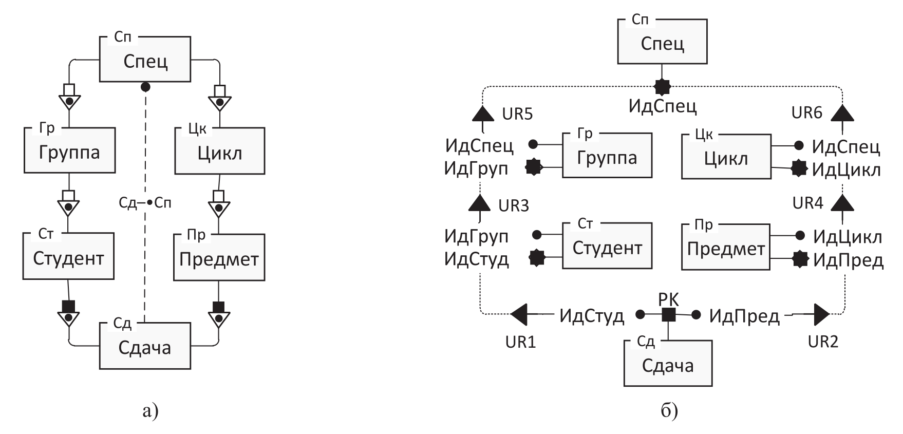 При переходе к РМ сущности становятся таблицами (см. рисунок 2б). В каждой таблице, если она не является полным иждивенцем, размещается SK (SK обозначены звёздами, а имена содержат префикс «Ид» – идентификатор). Связи преобразуются в FK (FK обозначены треугольниками, указывающими на соответствующий ключ родительской таблицы).