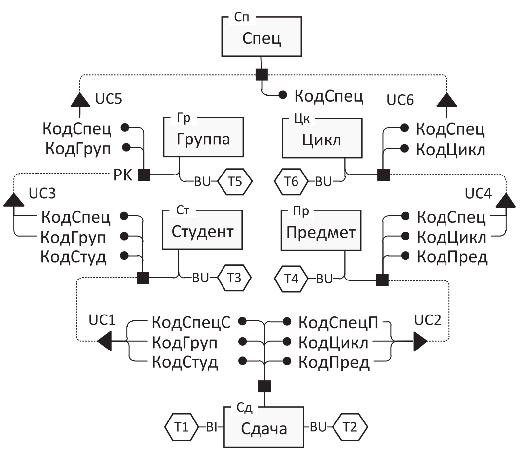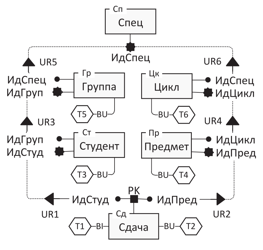 На рисунке 3 приведён пример РМ на основе SK (см. рисунок 2б), дополненной триггерами для обеспечения МП-целостности. Триггеры обозначены шестиугольниками, тип триггера указан в разрыве линии, соединяющей его с родительской таблицей: