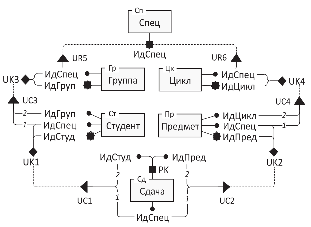 FK, задающие цепочки ЛВР, содержат идентификатор МП-предка, для чего в промежуточных таблицах предусмотрены соответствующие UK (обозначены тёмными ромбами). Например, уникальный ключ UK1 в таблице Студент задан как