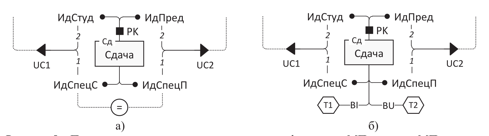 Рисунок 5 – Пример использования различных идентификаторов МП-предка в МП-потомке: а) – на основе условия CHECK; б) – на основе триггеров