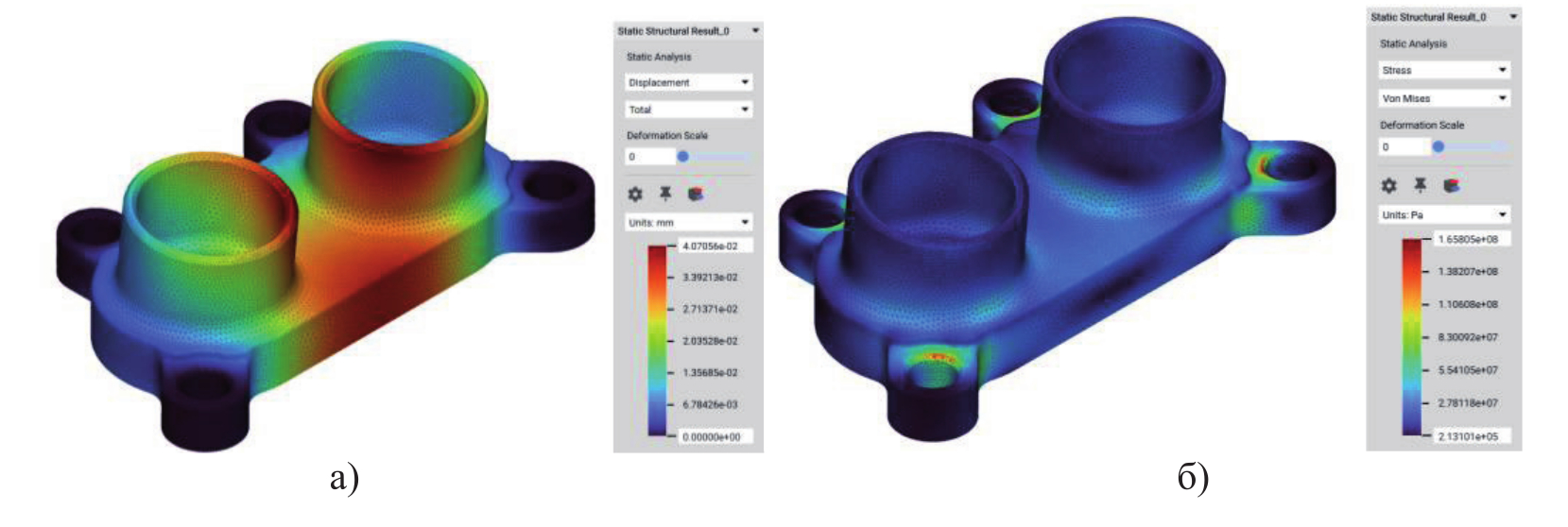 Полученные деформации находятся в диапазоне допустимых для тонкостенных алюминиевых элементов с крепёжной функцией. Максимальные напряжения (по Мизесу, см. рисунок 4б) достигают 165,8 МПа и локализуются в зонах сопряжения опорных отверстий и боковых поверхностей корпуса. Эти зоны характеризуются геометрическими переходами и стыками с высокими градиентами напряжений. С учётом предела текучести для сплава AlSi10Mg в условиях СЛП-печати (240–260 МПа), полученные значения находятся в допустимой области.
