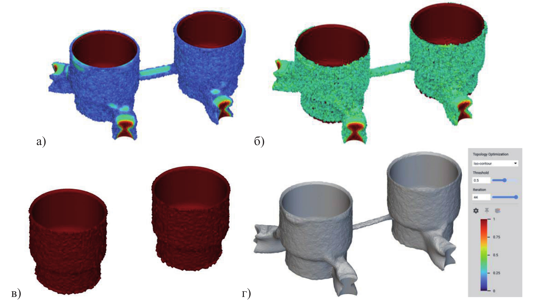 Значение порога отсечения влияет на то, какие элементы результирующей топологии сохраняются. Установка значения, стремящегося к нулю, приводит к включению в итоговую форму всех элементов, в т.ч. тех, которые получили нулевую плотность. В работе используется значение порога отсечения 0,5, что обеспечивает баланс между массой и сохранением несущих элементов (см. рисунок 6г).