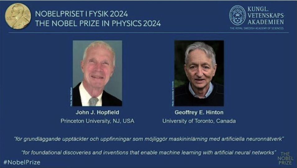 В этом году научную общественность удивило решение Нобелевского комитета16, которое подтвердило факт, что «информация правит миром». «Никто и подумать не мог, что лауреатами Нобелевской премии по физике станут нейробиологи и информатики» 17, но лауреатами Нобелевской премии18 по физике стали американский учёный Джон Хопфилд (1933 г.р.) и британско-канадский учёный Джеффри Хинтон (1947 г.р.) за «основополагающие открытия и изобретения, которые сделали возможным машинное обучение с использованием искусственных нейросетей». Научные достижения лауреатов также применяются при моделировании климата, разработке солнечных батарей и анализе медицинских изображений. Взяв за основу фундаментальные принципы физики, Хинтон и Хопфилд разработали алгоритмы, позволяющие использовать структуру машинных сетей для обработки информации, что позволяет программе обучаться и совершенствоваться самостоятельно, уже без помощи человека. Вдохновившись одной из систем, обнаруженных в атомной физике, Джон Хопфилд в 1982 году придумал сеть Хопфилда - нейросеть, способную запоминать изображения (и любые шаблоны), а потом воссоздавать их. Джеффри Хинтона некоторые называют «отцом ИИ», он главный среди тех, кто придумал первые «глубокие сети». Используя сеть Хопфилда и инструменты из статистической физики, Хинтон создал новый тип нейросетей - машину Больцмана, способную научиться распознавать в данных характерные элементы или признаки.