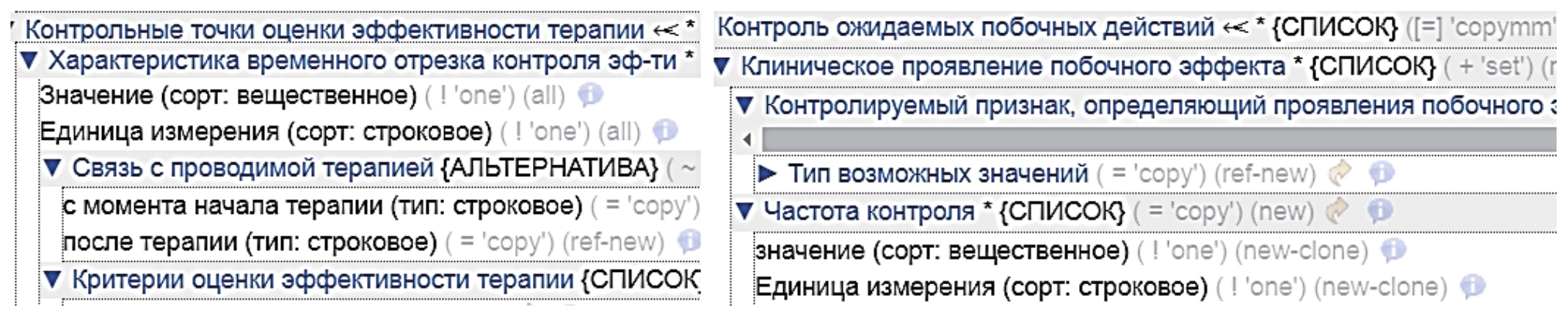 Фрагменты на рисунке 4 демонстрируют комплекс связей, позволяющих организовать пациент-ориентированный подход к проведению контрольных мероприятий по достижению целей терапии и отслеживать ожидаемый (возможный) выход за пределы физиологического «коридора норм». С помощью понятий, порождаемых по узлу «характеристика временно́го отрезка контроля эффективности» описывается временно́й интервал для контрольных исследований, «связь с проводимой терапией» – семантика зависимости процесса проводимой терапии, «критерии оценки эффективности» – описание ожидаемой клинической картины при достижении целей терапии. Кроме контроля по достижению целей терапии запланирован контроль ожидаемых побочных действий при проводимой терапии: временны́е изменения диапазона физиологических норм. Предлагаемые фрагменты позволят СППР клинических решений или подобным системам, обрабатывающим знания, осуществлять мониторинг процесса терапии и дифференцировать не только достижение целей терапии, но и объяснять клинически обусловленный выход из физиологической нормы.