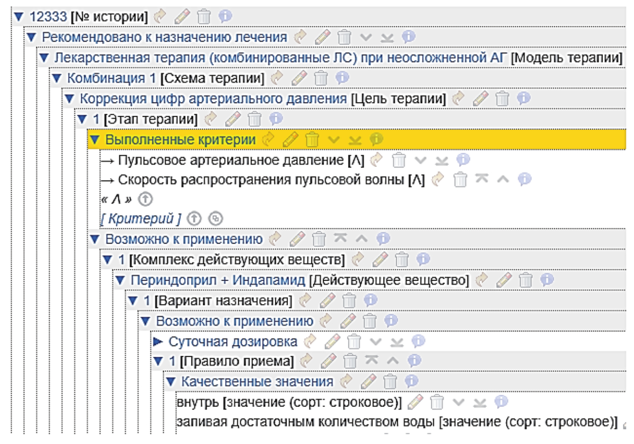 Таким образом, реализуется динамический контроль текущего клинического состояния пациента на фоне проведения медикаментозной терапии. Для оценки эффективности проводимой терапии в ГЗ лечения для каждого ЛС или их комбинации предусмотрен элемент знаний «критерии оценки эффективности лечения», согласно которому в данном клиническом примере формируется описание ежедневного контроля эффекта проводимой терапии через signNamejt = артериальное давление.