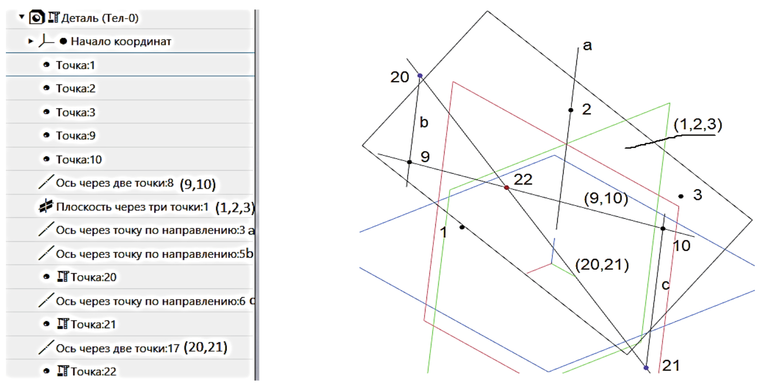- проводится ось (прямая) через точки 9 и 10 и строится плоскость (1,2,3);