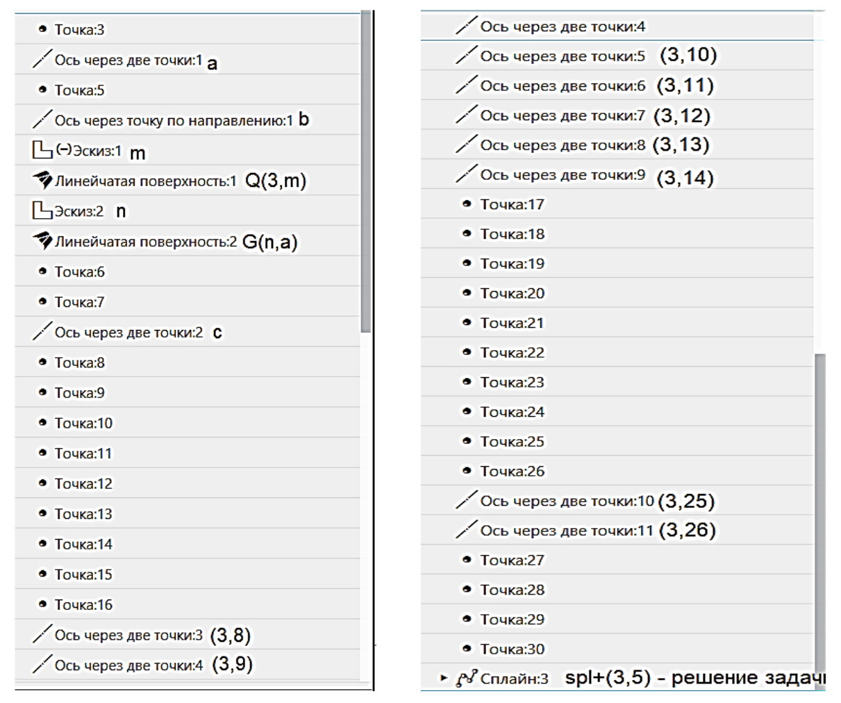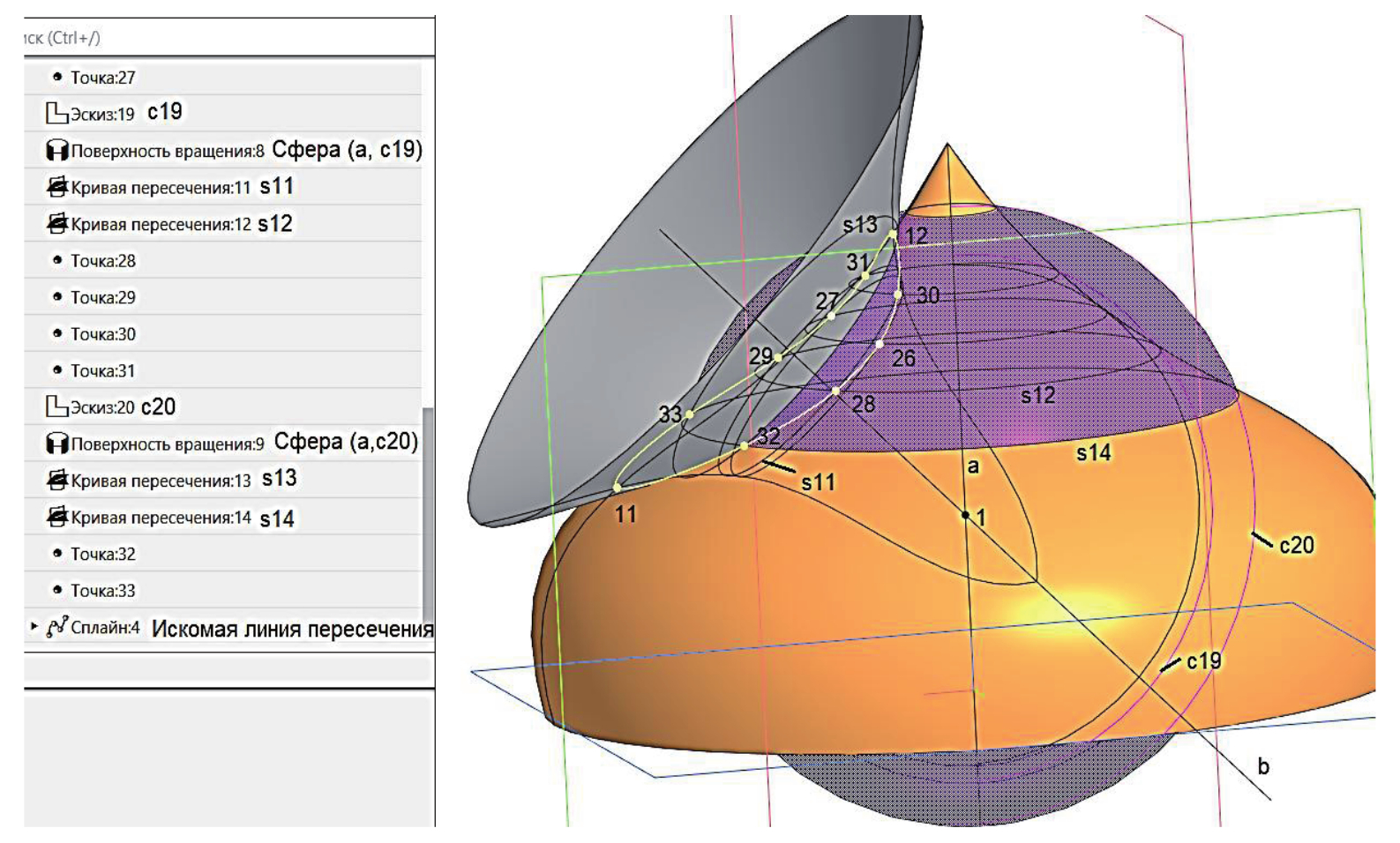 Для второй поверхности вращения G(b,n) её формирование выполнено вращением полумеридиана n относительно оси b. Координатной плоскости ZX принадлежат составные очерки () и () исходных поверхностей Q и G соответственно. Точки пересечения этих очерков (две точки) служат опорными точками искомой линии пересечения исходных поверхностей. На рисунке 6 приведена сфера (a, c18), построенная как поверхность вращения по оси a и полуокружности c18 с центром на оси a. Сфера (a, c18) пересекает поверхности G и Q по окружностям s9 и s10 соответственно, общие точки 26 и 27 которых принадлежат искомой линии пересечения . На рисунке 7 в дереве построений приведена последовательность построений промежуточных точек линии пересечения и их визуализация на 3D-модели на основе использования способа секущих концентрических сфер, который соответствует алгоритму 2. Интерполяция полученного пространственного дискретного ряда даёт искомую линию пересечения (сплайн 4 в дереве построений) исходных поверхностей вращения Q и G.