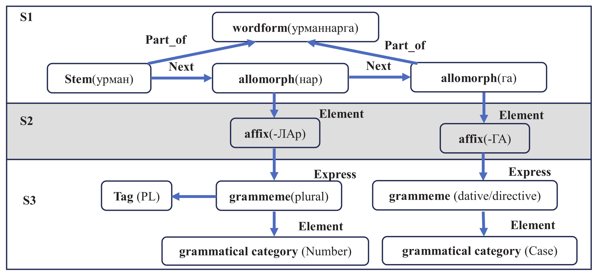 Уровень S2 – морфемный уровень, содержит узлы ГЗ с информацией об аффиксальных морфемах татарского языка. Информация уровня S2 едина для отдельного ТЯ и узлы уровня S1 ссылаются на узлы из уровня S2.