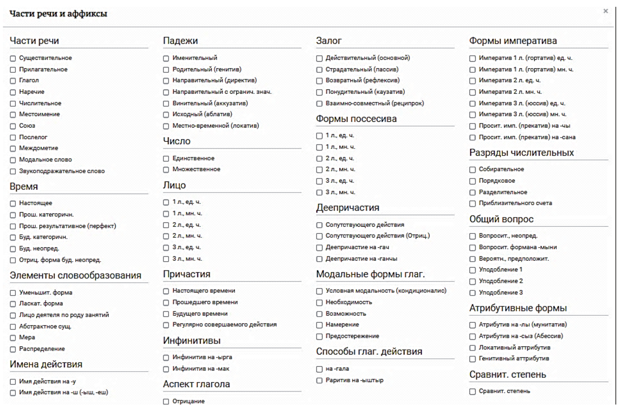 Рисунок 2 – Интерфейс для поиска в корпусе «Туган тел» по грамматическим категориям
