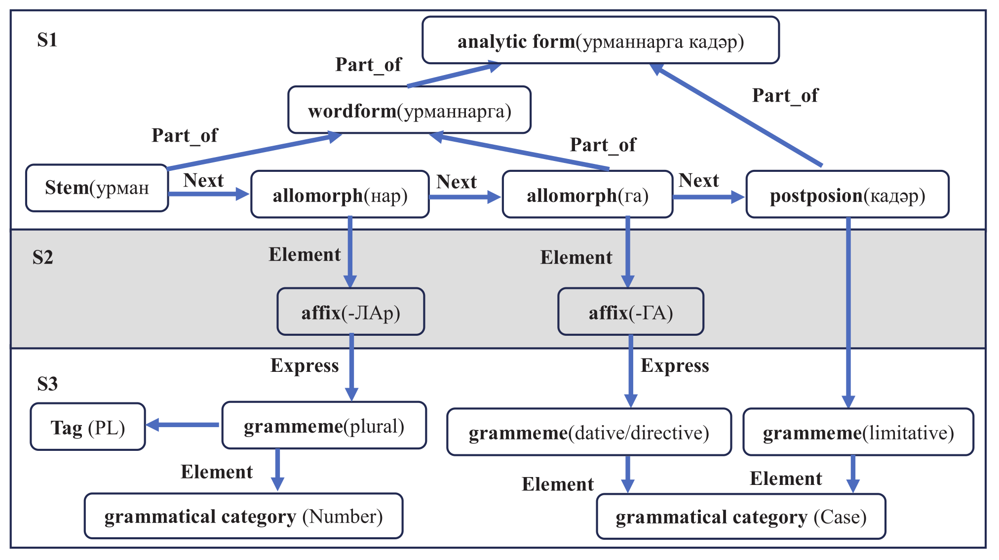 В проекте создания лингвистического портала «Тюркская морфема» [12] предложена модель лингвистического ГЗ ТЯ TurkLang, которая подходит для описания потенциальных возможностей языка и фактических данных, представленных в ЭК с текстами на ТЯ. Минимальной лингвистической единицей, представленной в этой модели, являются морфемы: корневая, аффиксальная и аналитическая. Это позволяет текст каждого предложения в корпусе представлять в виде последовательности морфем. Представление словоформы в виде фрагмента ГЗ согласно данной модели показано на рисунке 1. В узлах представлена информация о типе узла, а в скобках - содержимое конкретного узла. Узлы и рёбра фрагмента ГЗ можно условно отнести к трём уровням S1, S2, S3.