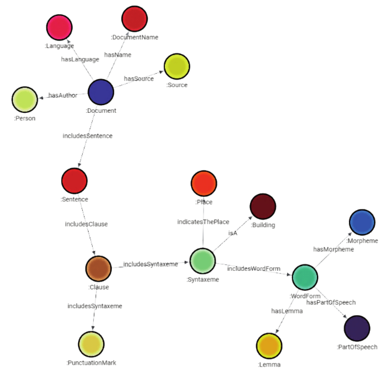В отличие от схемы, реализованной с помощью СУБД MariaDB, в графе дополнительно появляются узлы типов «Clause» («Клауза»), «Syntaxeme» («Синтаксема»), «PunctuationMark» («Знак препинания»), «Morpheme» («Морфема»), «PartOfSpeech» («Часть речи»), необходимых для дальнейшего представления словоформ, клауз и синтаксем. Также в графе появляются узлы «Language» («Язык»), «Person» («Человек»), «Source» («Источник»), «DocumentName» («Название документа»), «Place» («Место»), «Building» («Здание»), необходимые для дальнейшего представления семантических связей с соответствующими объектами. Количество типов таких узлов неограниченно, и их набор может быть расширен без внесения изменений в основной ГЗ.