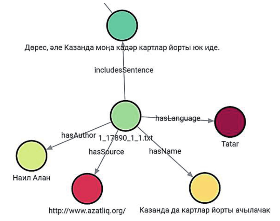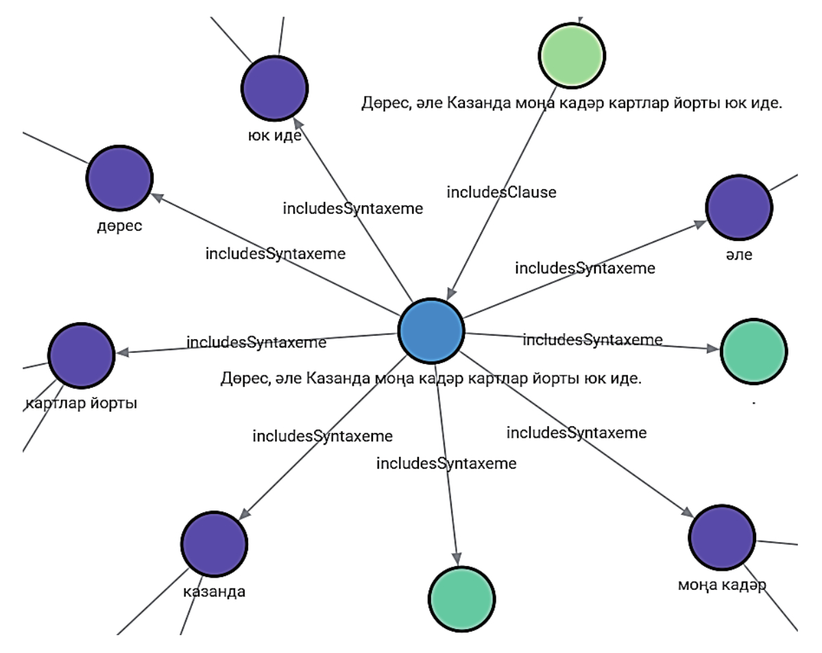 В качестве примера в представленную структуру можно поместить предложение: «Дөрес, әле Казанда моңа кадәр картлар йорты юк иде» («И вправду, до сих пор в Казани не было дома престарелых») с морфологической разметкой, извлечённой из существующего ЭК. Для узлов типа «Sentence» предусмотрено два свойства, в которых хранятся данные о предложении в целом: «name» (предложение без морфологической разметки), «full» (предложение с морфологической разметкой). Добавление предложения осуществляется при помощи запроса на языке Cypher: