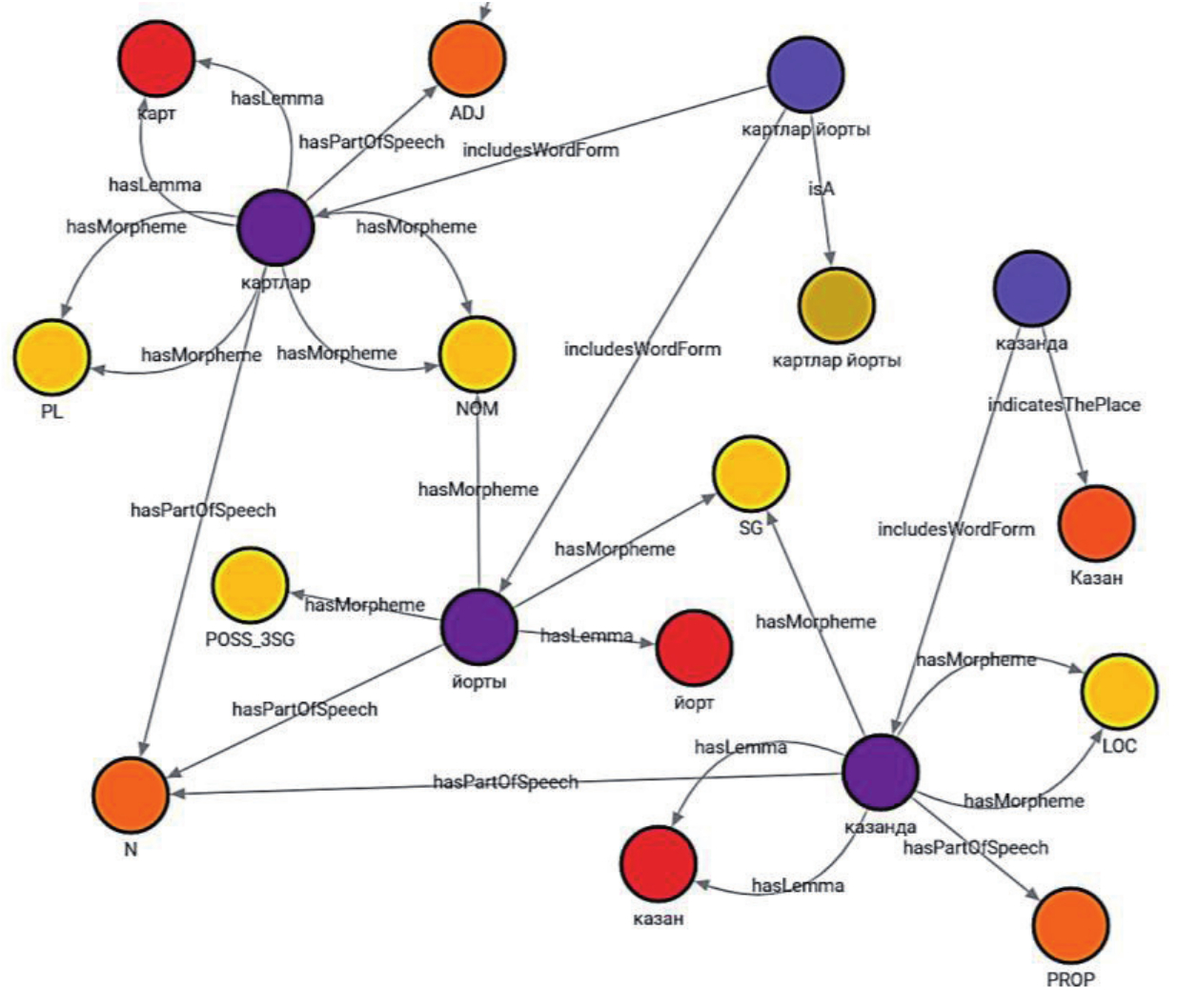 На рисунке 8 показан подграф, созданный после выполнения указанных запросов для синтаксем “Казанда” и “картлар йорты”. На этом подграфе уже видны общие вершины графа для различных типов узлов и рёбер, например, все три словоформы из примера имеют связь с частью речи “N” (существительное), так как для всех трёх словоформ существует морфологическая разметка с указанием этой части речи.