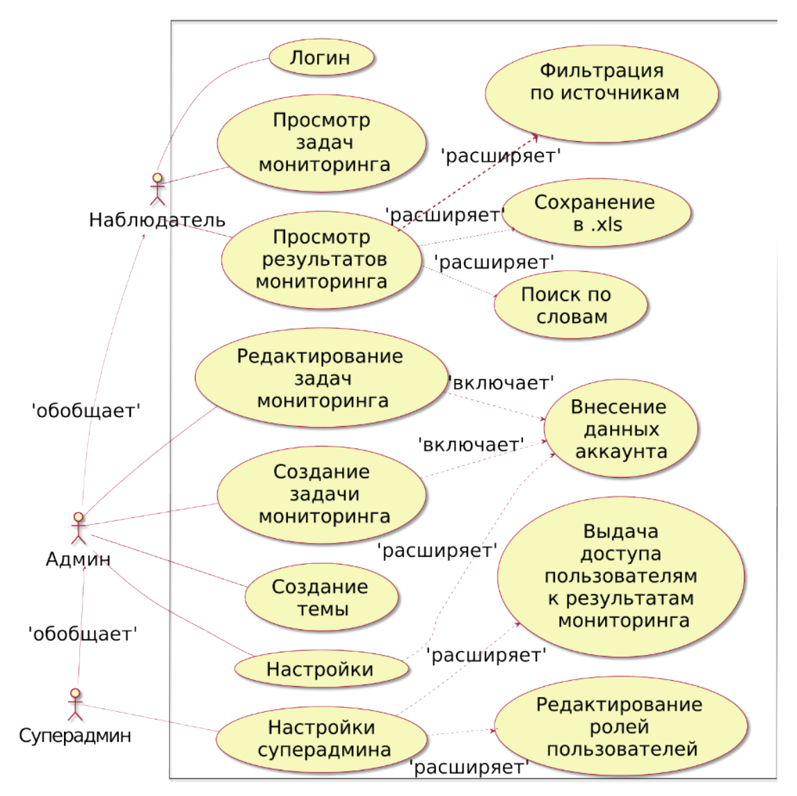 Админ доступны все инструменты для конфигурирования мониторинга социальных сетей. Роль Суперадмина расширена относительно Админ управлением пользователями – создание, удаление, назначение ролей пользователям, а также конфигурирование мониторинга каждого из них. Роль Наблюдателя позволяет просматривать результаты мониторинга, сконфигурированного для Наблюдателя пользователем Суперадмин.