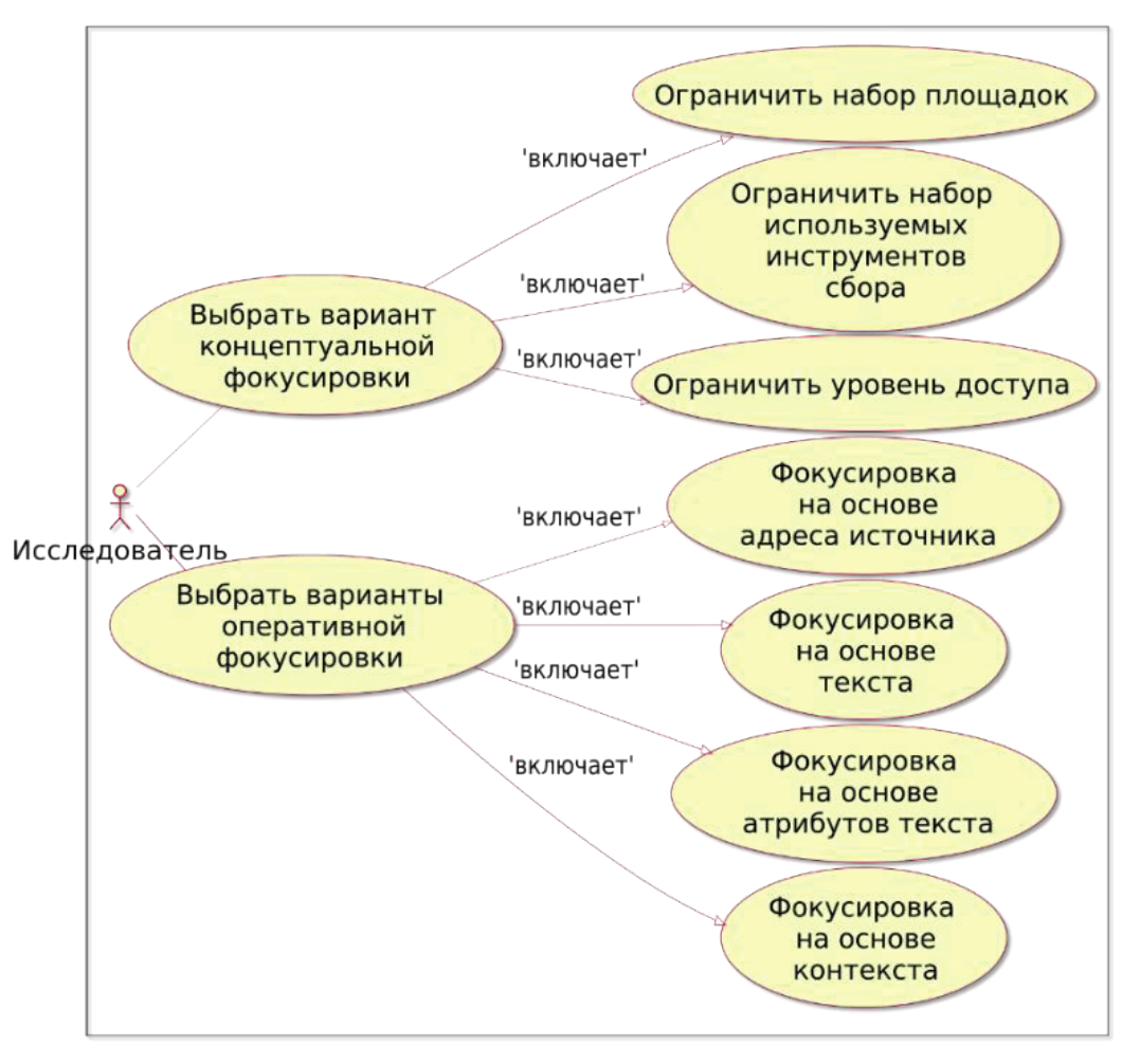 Используемые варианты обеспечивают ограничение обрабатываемого информационного пространства. Первые два - концептуальные - задают общие ограничения, которые на этапе проектирования системы влияют на выбор потенциально используемых в работе подходов, инструментов и технологий. Третий и четвёртый уровни - оперативные - предполагают получение эффектов от фокусировки в процессе непосредственной работы ИС, сконфигурированной с теми или иными параметрами. Перечисленные способы фокусировки используются в данной работе и представлены на рисунке 6 в виде UML-диаграммы вариантов использования.