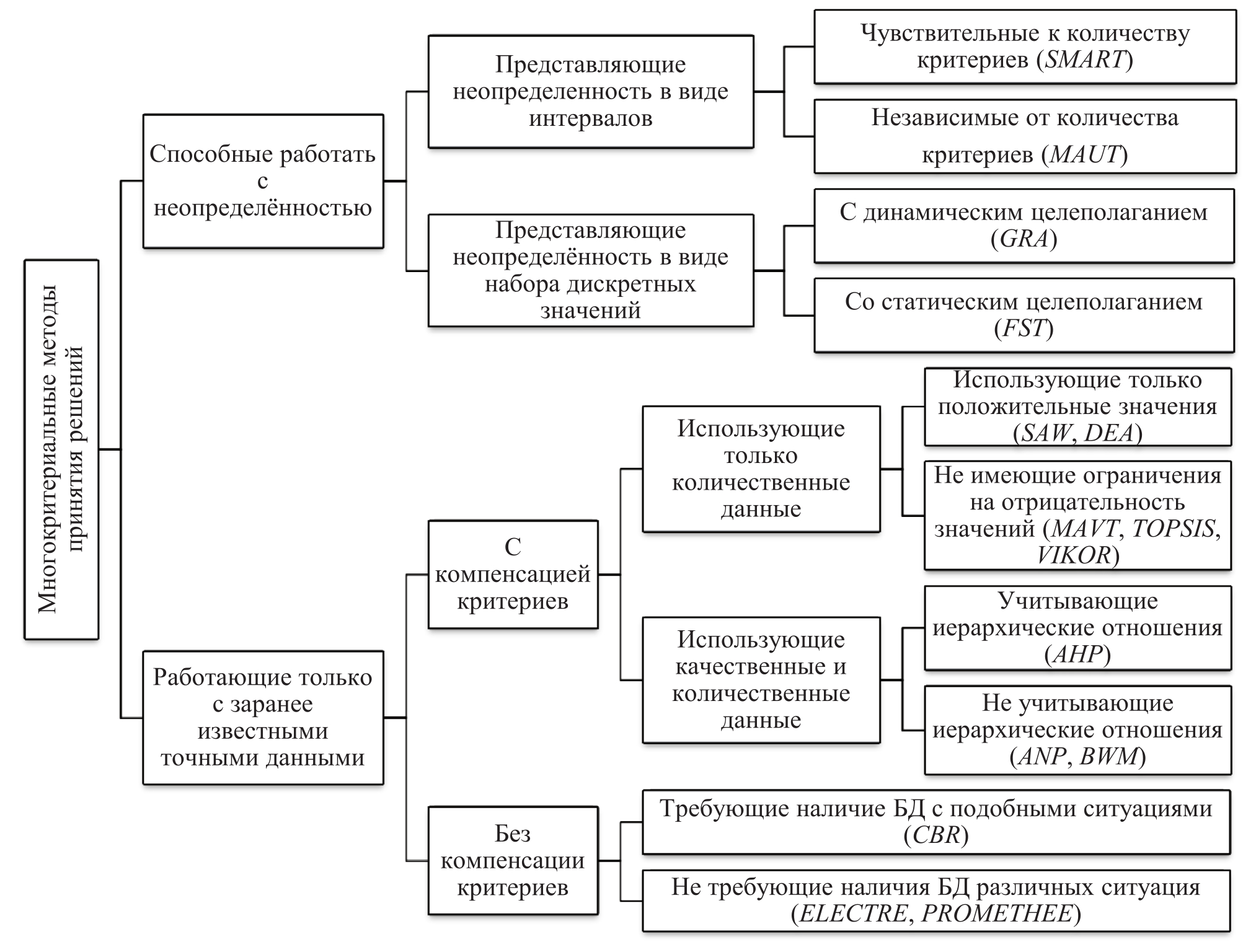 Исходя из представленных результатов исследований [8, 9, 38], можно ограничить круг рассматриваемых ММПР следующими методами: SAW, MAUT, MAVT, SMART, AHP, ANP, BWM, TOPSIS, VIKOR, CBR, DEA, ELECTRE, PROMETHEE, Fuzzy-методами и GRA.