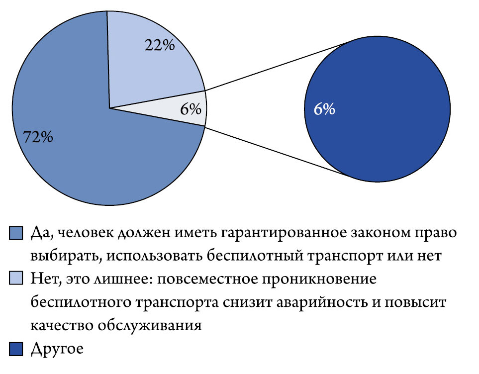 Лишь 22% респондентов указали альтернативный вариант, при котором возможность выбора транспорта не должна предусматриваться. Этот вариант звучал следующим образом: «Нет, это лишнее: повсеместное проникновение беспилотного транспорта снизит аварийность и повысит качество обслуживания». В рамках опроса некоторые респонденты также высказали мнение, что в целом необходимо отталкиваться не от реального выбора пассажиров, а от соображений безопасности: безопасность должна быть обеспечена на транспорте для всех пассажиров, а способы, которыми эта цель будет достигаться, в данном случае вторичны.