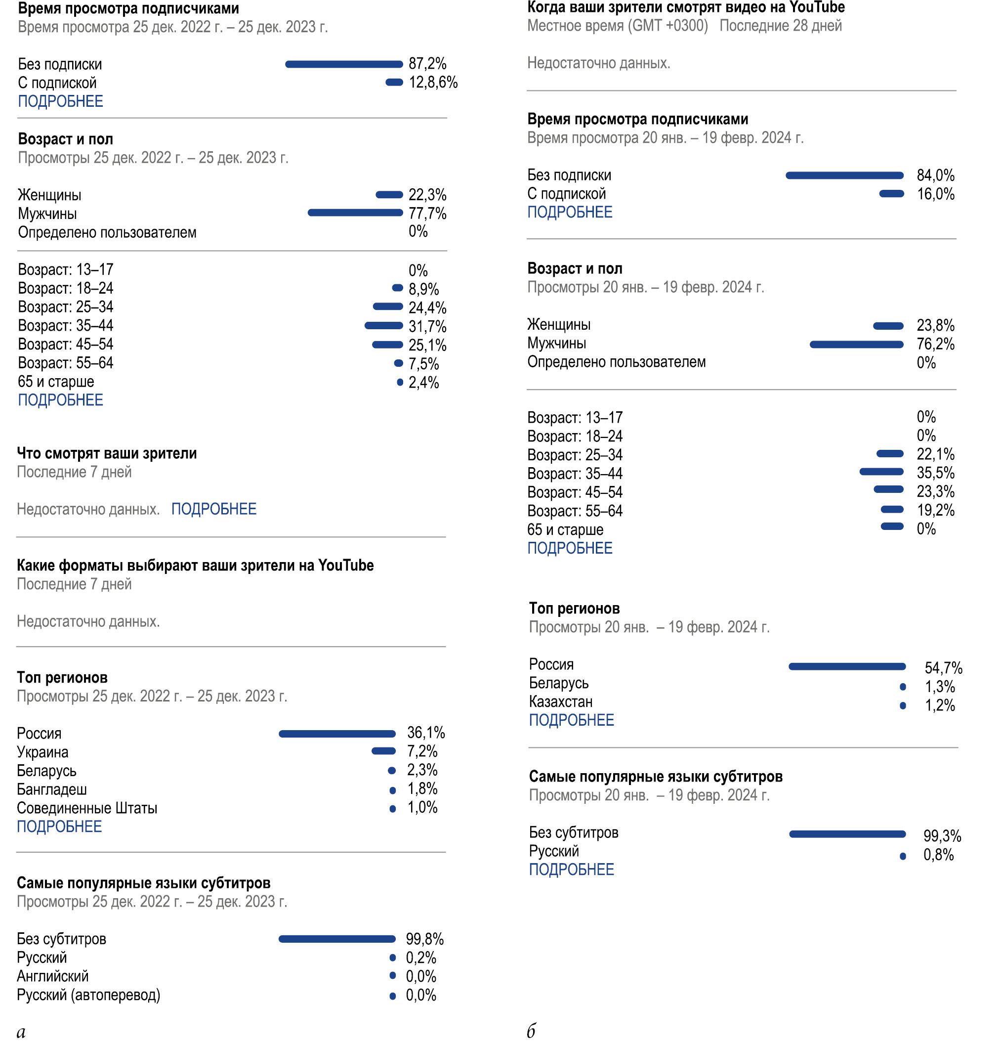 Рис. 4. Пол и возраст целевой аудитории артистов ЕШШКА (а) и W&V (б). Данные из личных кабинетов артиста (ЕШШКА — источник: лейбл Media Sharks, W&V — источник: YouTube-канал Witch&Vamps)