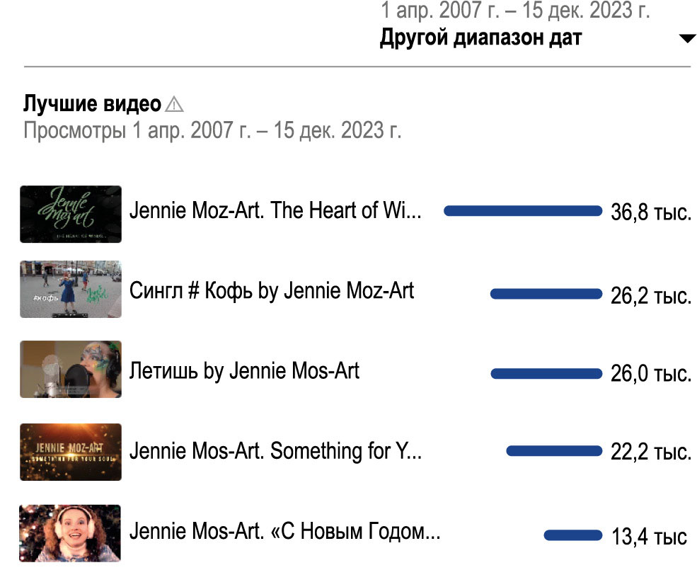 - Melodiya tvoei dushi (single) (in Russ.). Jennie Moz-Art. Melody of Your Soul (Single) // Jennie Moz-Art Official [YouTube channel]. 28, April, 2022. — URL: https://youtu.be/qVdXIGNJ1-g?si=WCfFnjKD8ISg7pGy (access date: 17.04.2024).