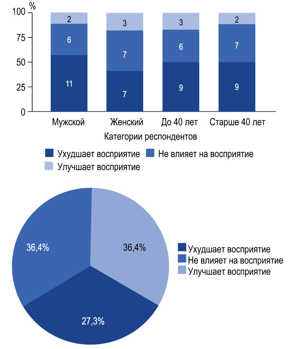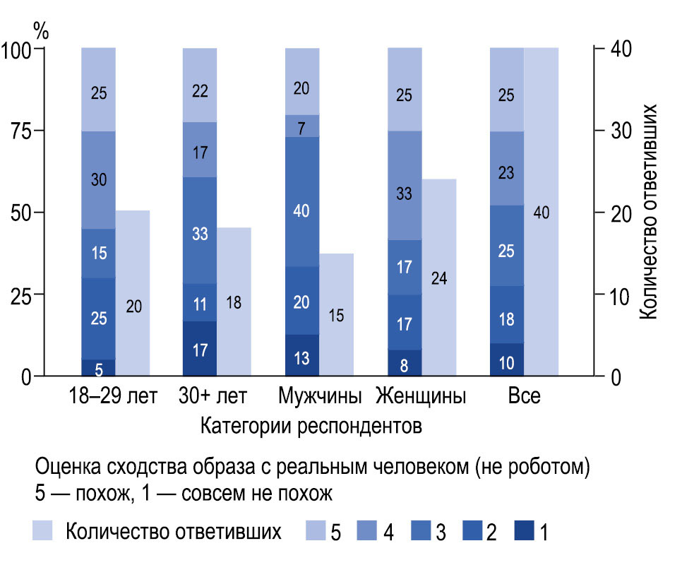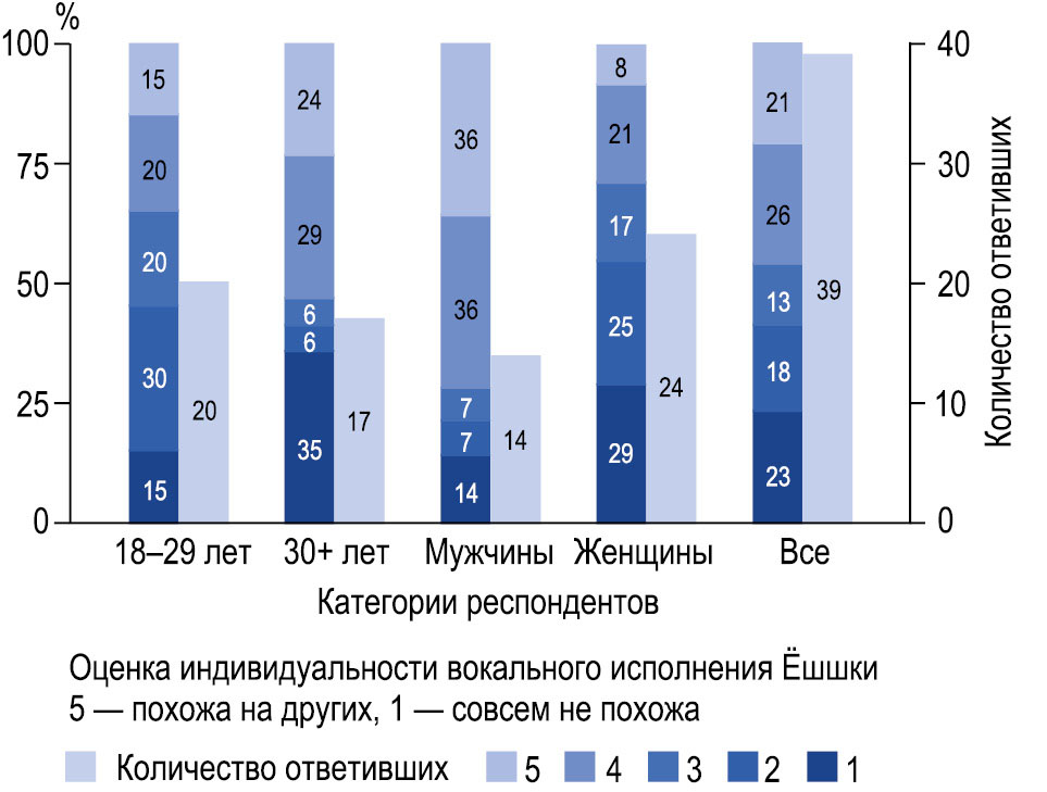 Из инфографики видно, что ядром целевой аудитории артистки Jennie Moz-Art являются мужчины (63,6%) в возрастном диапазоне от 25 до 54 лет и женщины (36,4%) в возрастном диапазоне от 18 до 54 лет. Приняв эти данные за исходные, авторы исследования создали три опроса по продуктам нейросетевой генерации мультфильмов для производных артистов — полунейросетевой-полуантропоморфной певицы ЕШШКА и живого антропоморфного инди-рок-дуэта W&V. Для последующих опросов формирование фокус-группы происходило по принципу добавления к ядру желающих продолжать участие в экспериментах лояльных целевых потребителей новых респондентов, чья профессиональная деятельность и/или музыкальные интересы связаны с инди-музыкой и генеративным искусством. Таким образом, динамика приращения ядра целевых потребителей экспериментального музыкального контента с нейросетевой визуализацией позволяла проанализировать дополнительный параметр — процент удержания лояльности зрителя/слушателя к новым медиапродуктам оцениваемого артиста.