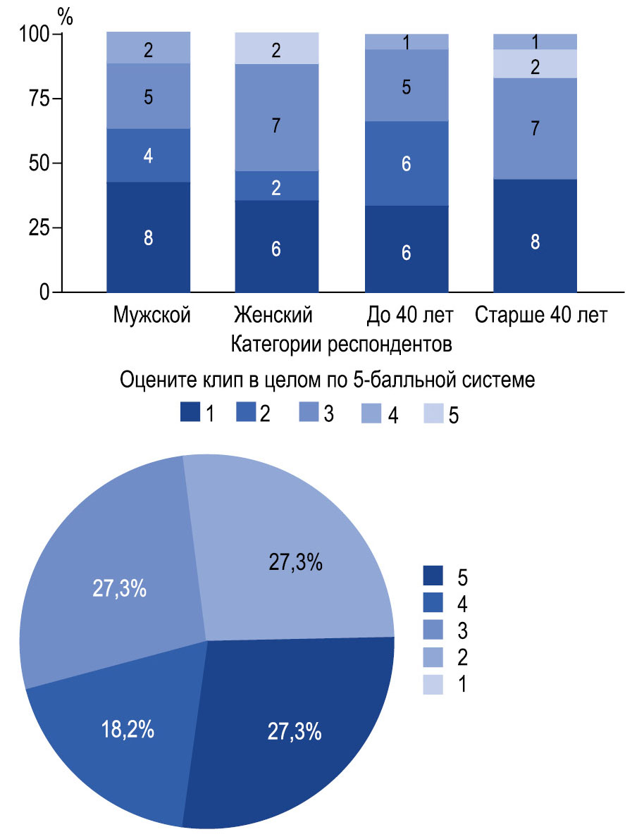 - Опрос фокус-групп по каждому из предложенных медиапродуктов (кроме тестовой песни Jennie Moz-Art «Ешкин кот», для трех опубликованных визуализаций которой собиралась исключительно статистика просмотров на YouTube).