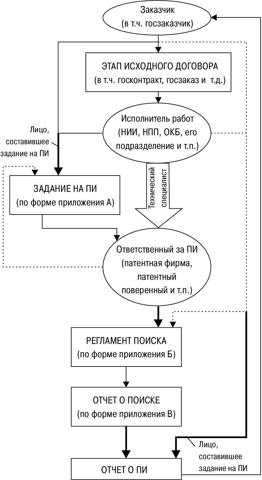 Согласно ГОСТ Р 15.011-2022, в проведении ПИ выделены три участвующие стороны: заказчик (например, госзаказчик), исполнитель работ (например, НИИ) и ответственный за ПИ (например, патентная фирма или патентный отдел). Ниже представлена схема взаимодействия сторон при проведении ПИ (рис. 2): тонкими сплошными линиями обозначен процесс подготовки и направления документации, жирными — процесс подписания, пунктирными — процесс согласования.
