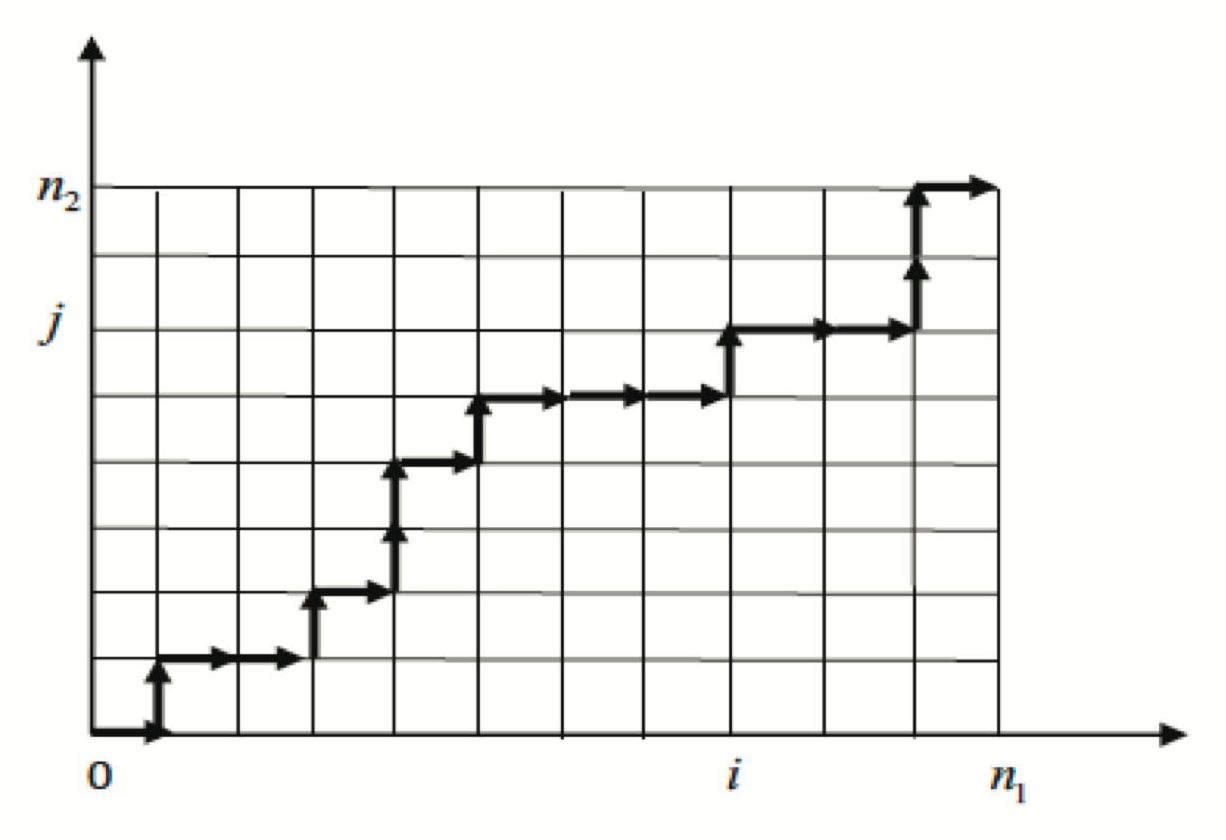Пусть — целочисленная решетка на плоскости. Частица на первом шаге выходит из точки и на – ом шаге она заканчивает блуждание в точке , совершая скачков «вправо» и скачков «вверх». Траектории частицы будут находиться во взаимно однозначном соответствии с векторами Z. Равенство , в векторе Z соответствует скачку вправо на l шаге, если же , — скачку вверх.