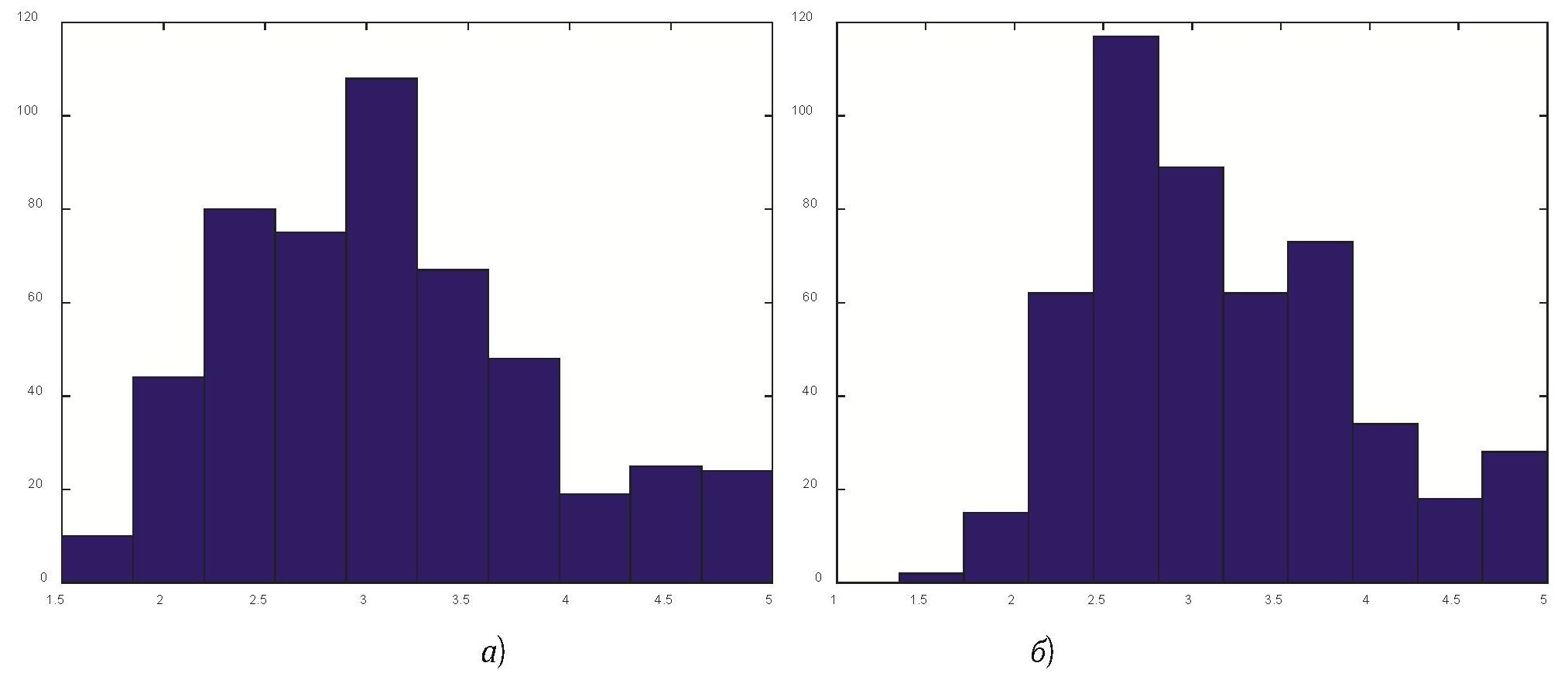 Рис. 2. Гистограммы оценок при : Экспоненциальное распределение распределение Вейбулла (а), (б).