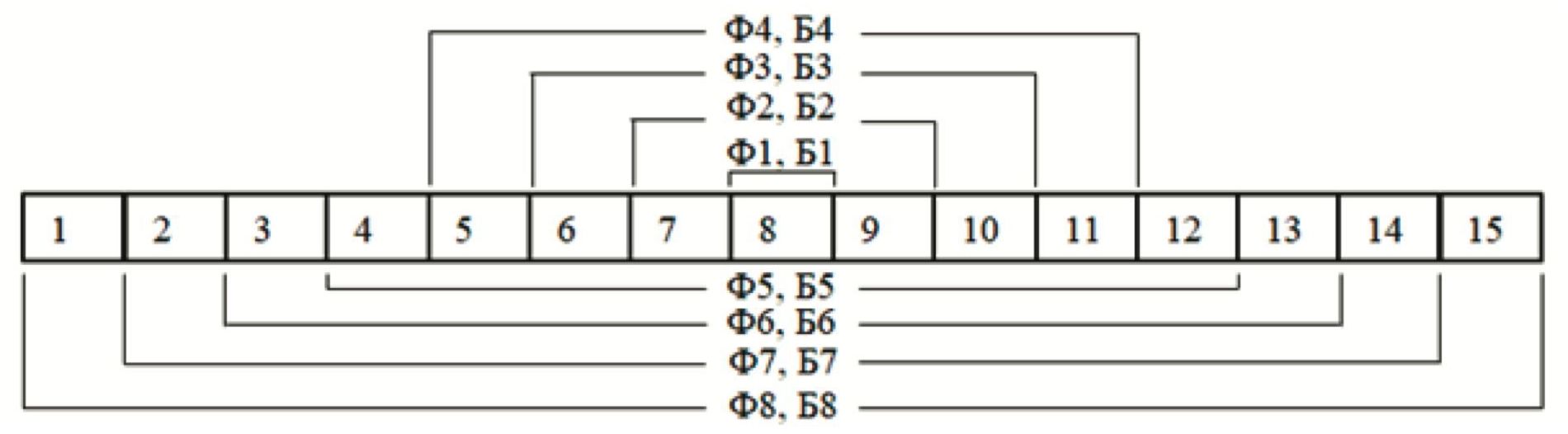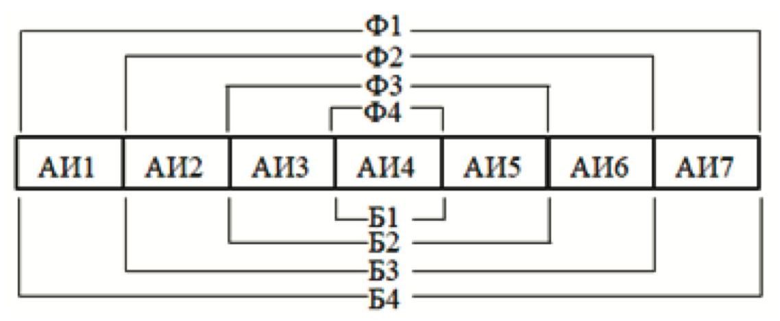 На рис. 5 представлен один из вариантов распределения диапазона рабочих частот сигнала для линейной АР с количеством излучателей . В данном варианте рабочий диапазон сигнала распределен на восемь поддиапазонов (Ф1…Ф8) и соответственно сформированы восемь блоков АИ (Б1…Б8). Цифры в прямоугольниках обозначают текущий номер АИ.