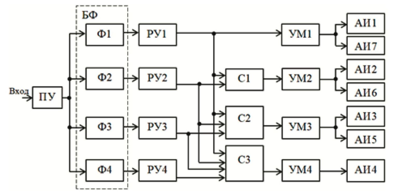 На схеме обозначено: ПУ — предварительный усилитель, БФ — блок фильтров, РУ1…РУ4 — регулирующие устройства, С1…С3 — линейные сумматоры, УМ1…УМ4 –усилители мощности.