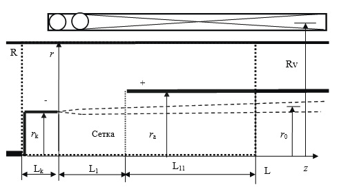 Выбираемая расчетная область, на границах которой задаются граничные условия при расчете электрического поля, окаймлена на рис. 2 пунктирной линией. Ее размеры R, L определяются задаваемыми размерами катода, анода и диаметром вакуумного кожуха. Анод и кожух находились под нулевым потенциалом, катод — под заданным отрицательным потенциалом 200–600 кВ. Длина выбирается такой, чтобы электрическое поле было нулевым при z = L. Соленоид представляет собой намотку Nv витков в один слой, средний радиус Rv, и провода заданного диаметра Dv, равномерно распределенные на заданной длине. Для получения приближенных оценок магнитное поле задавалось постоянным (эти параметры являются входными данными).