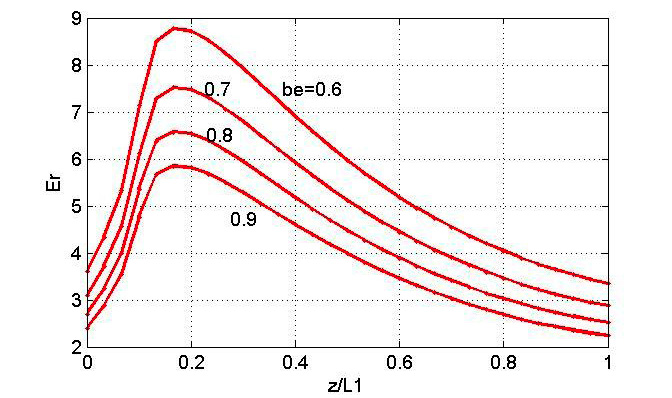 Ниже приведены результаты расчетов по уточненной модели, учитывающей реальный начальный разброс скоростей как по энергиям, так и по углу разброса (). Начальный встрел электронов осуществлялся на расстоянии h = 0.0005 м от острия (). Расчет по формуле (9) показал, что начальные энергии встреливаемых электронов достигают 20–45 кВ (0.27–0.4) при рассматриваемых напряжениях 200–600 кВ. Магнитное поле соленоида рассчитывалось по формулам (13) (рис. 3) и имело реальную продольную неоднородность в области формирования в зависимости от расположения катушки соленоида относительно острия катода.